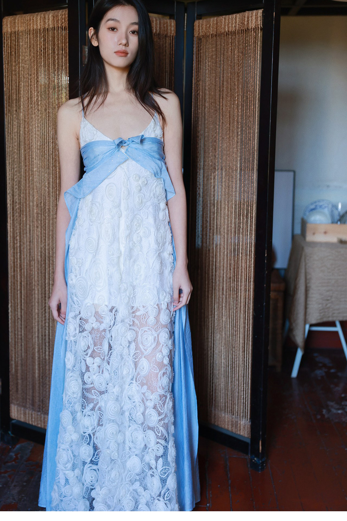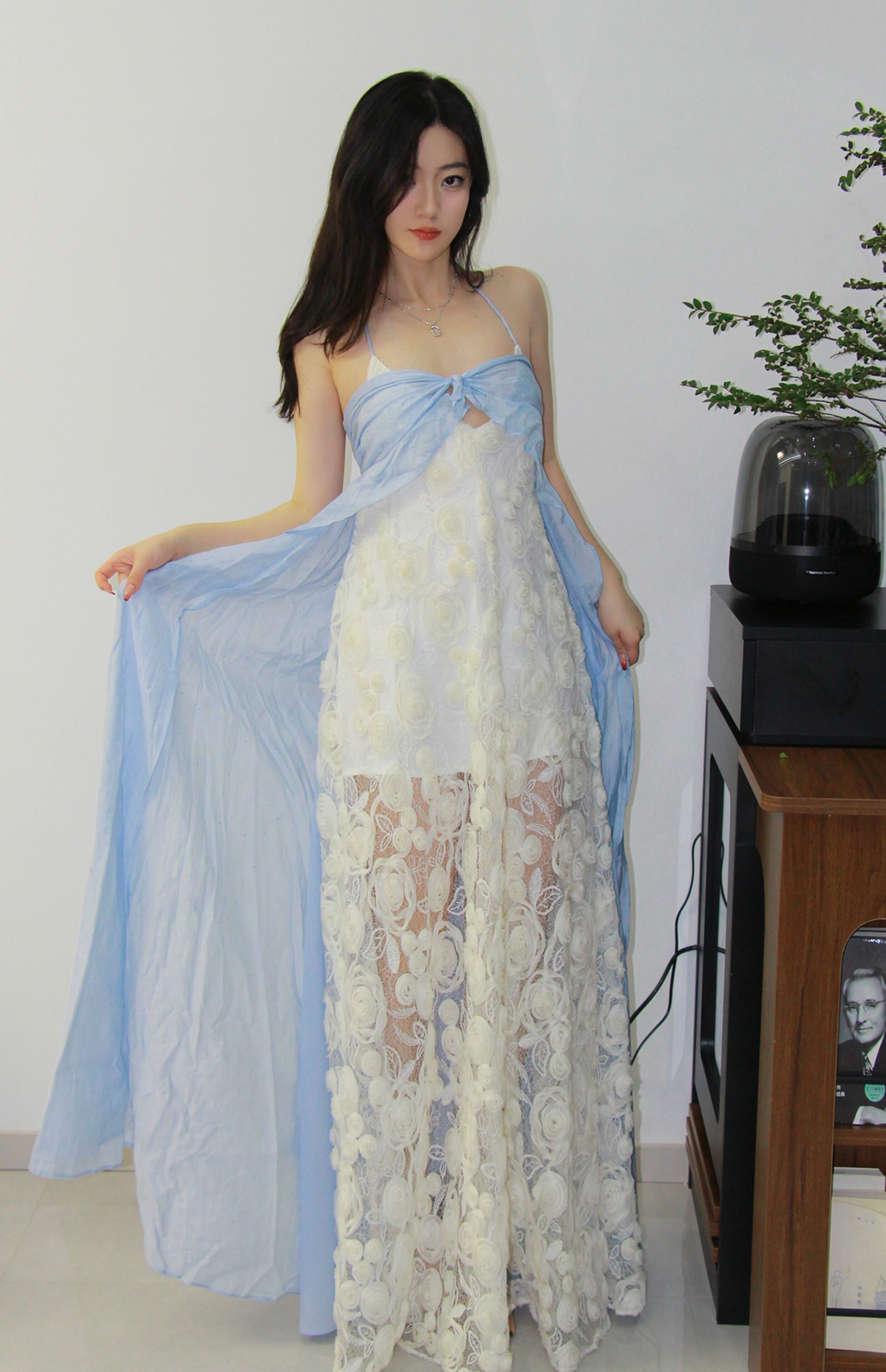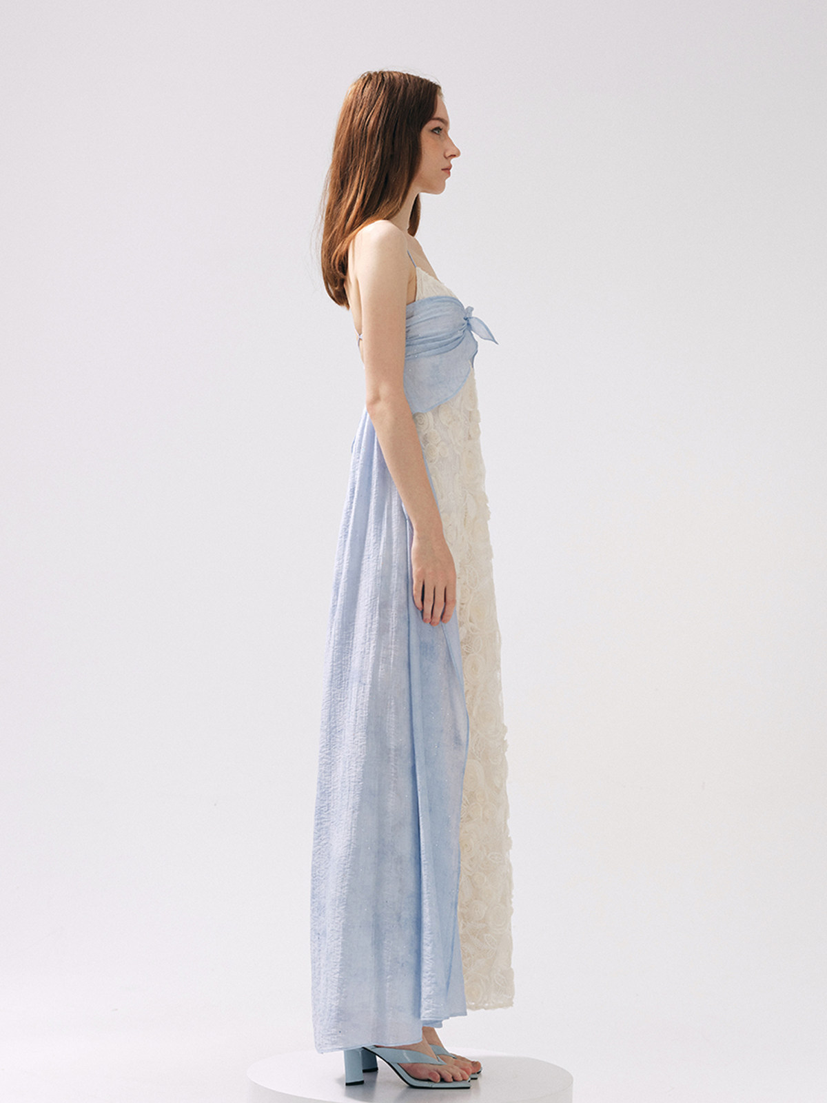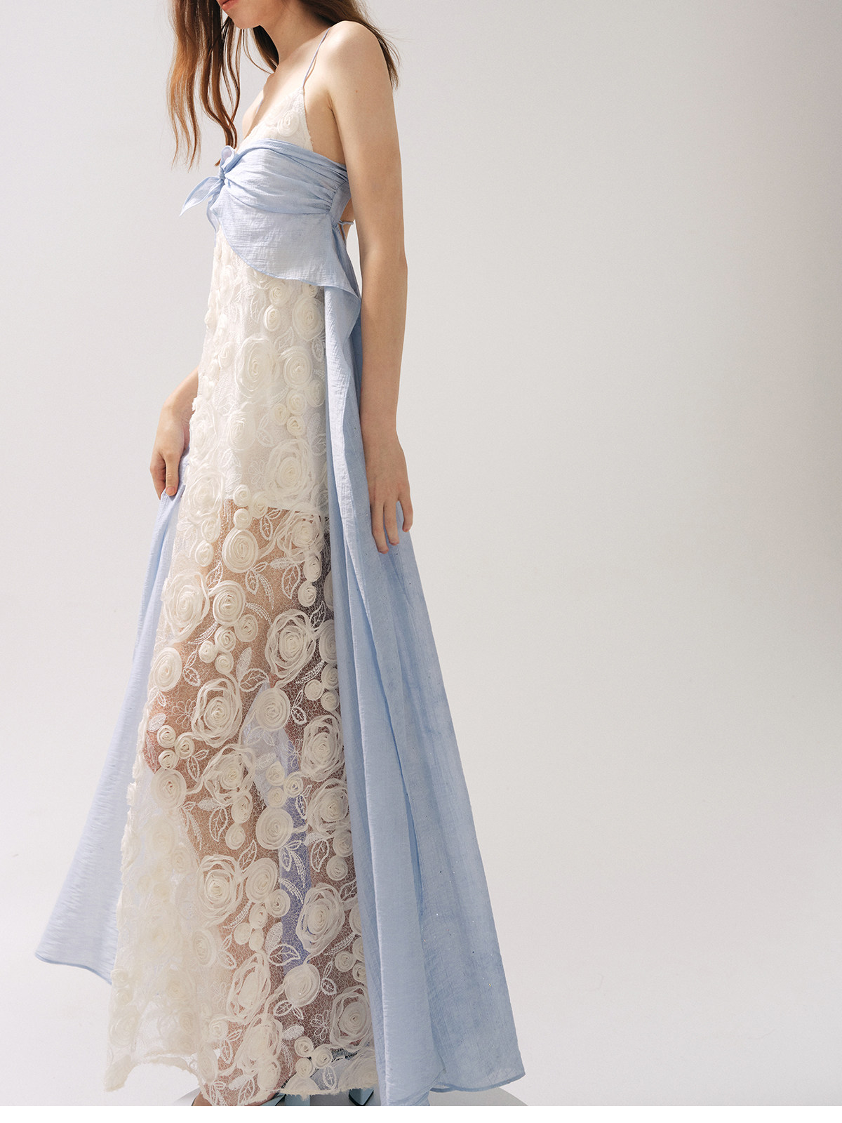 Moodxmiura платье сине -белая сетка розы сетка сплайсинга.