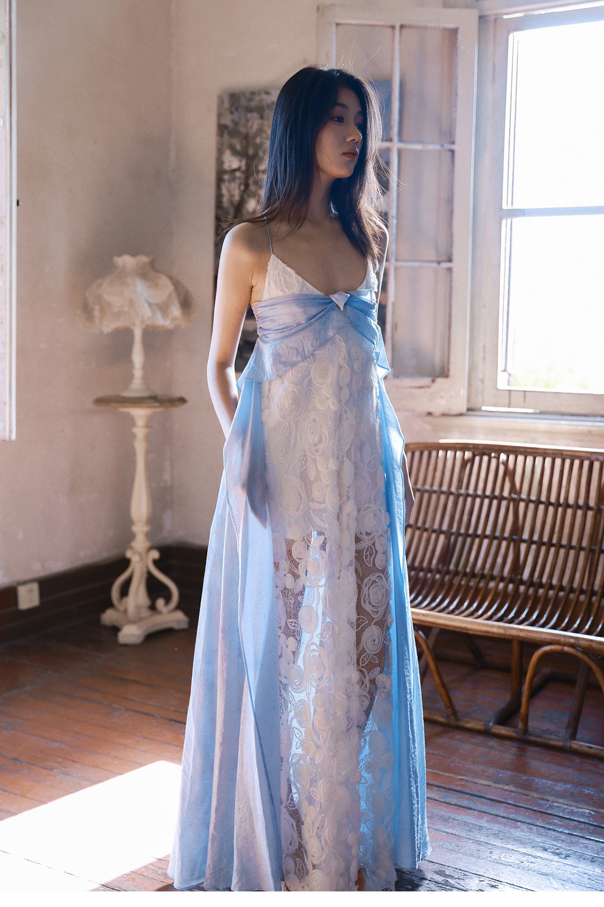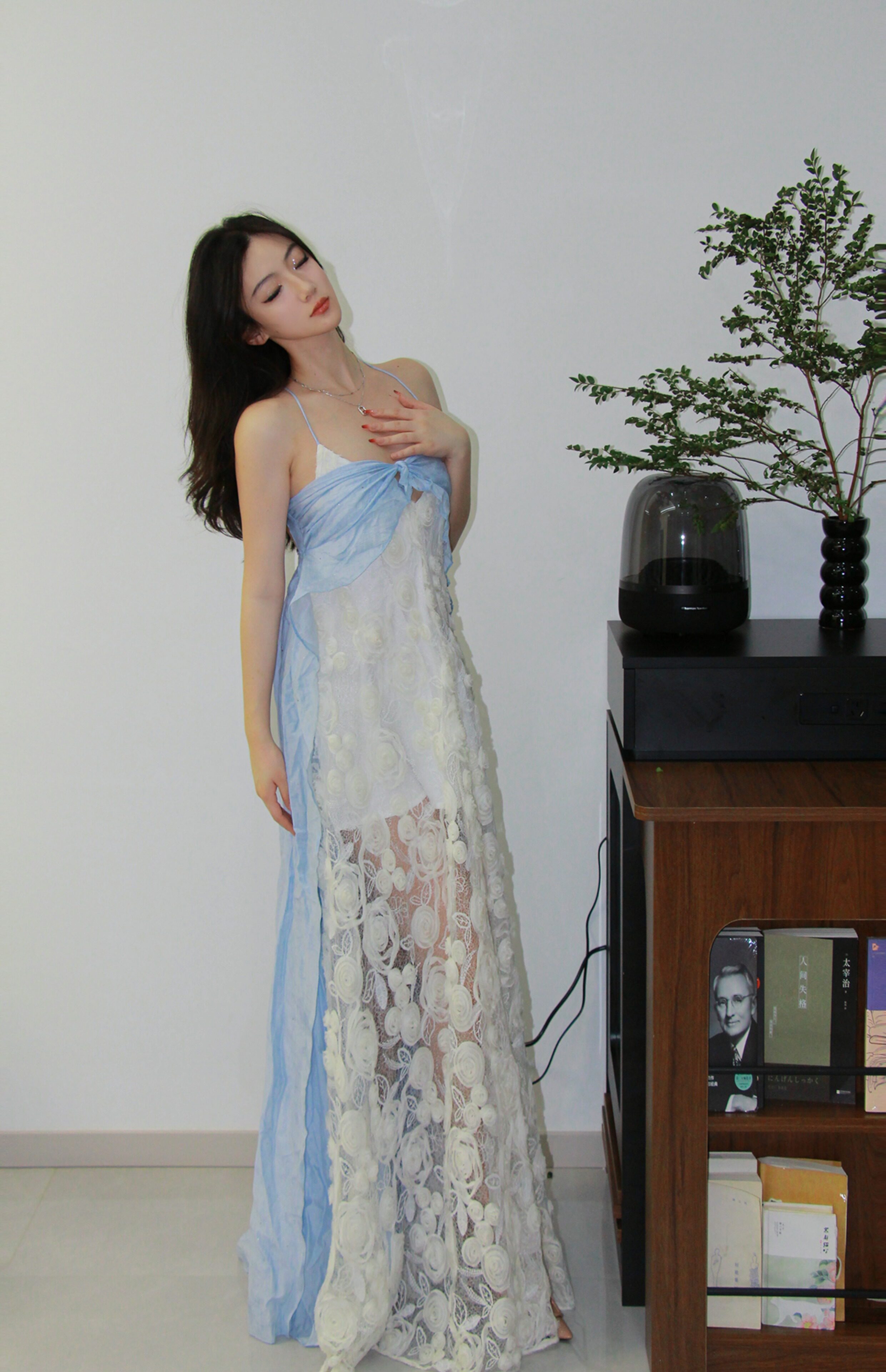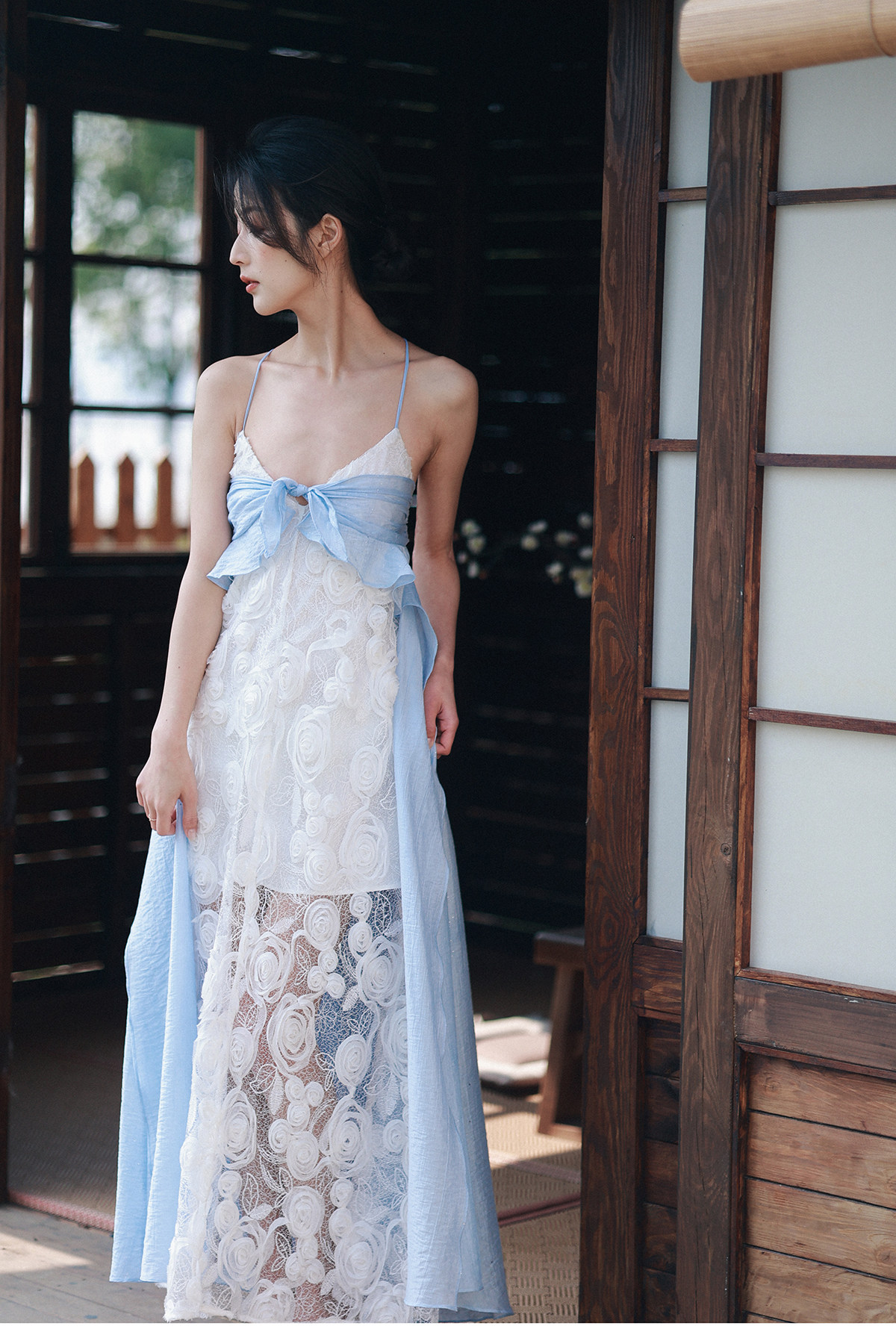 Moodxmiura платье сине -белая сетка розы сетка сплайсинга.