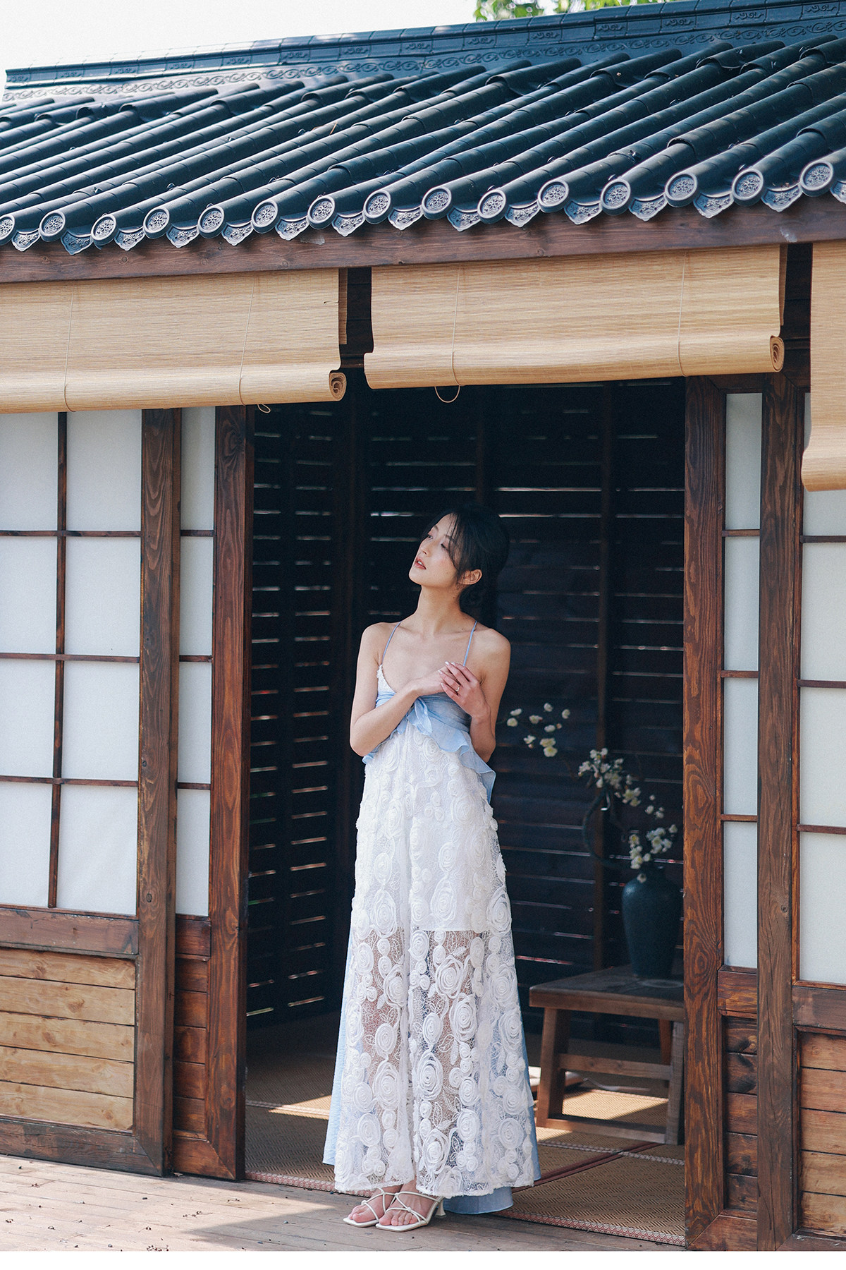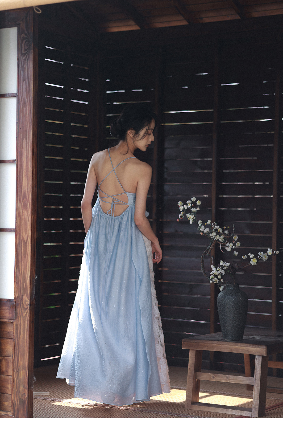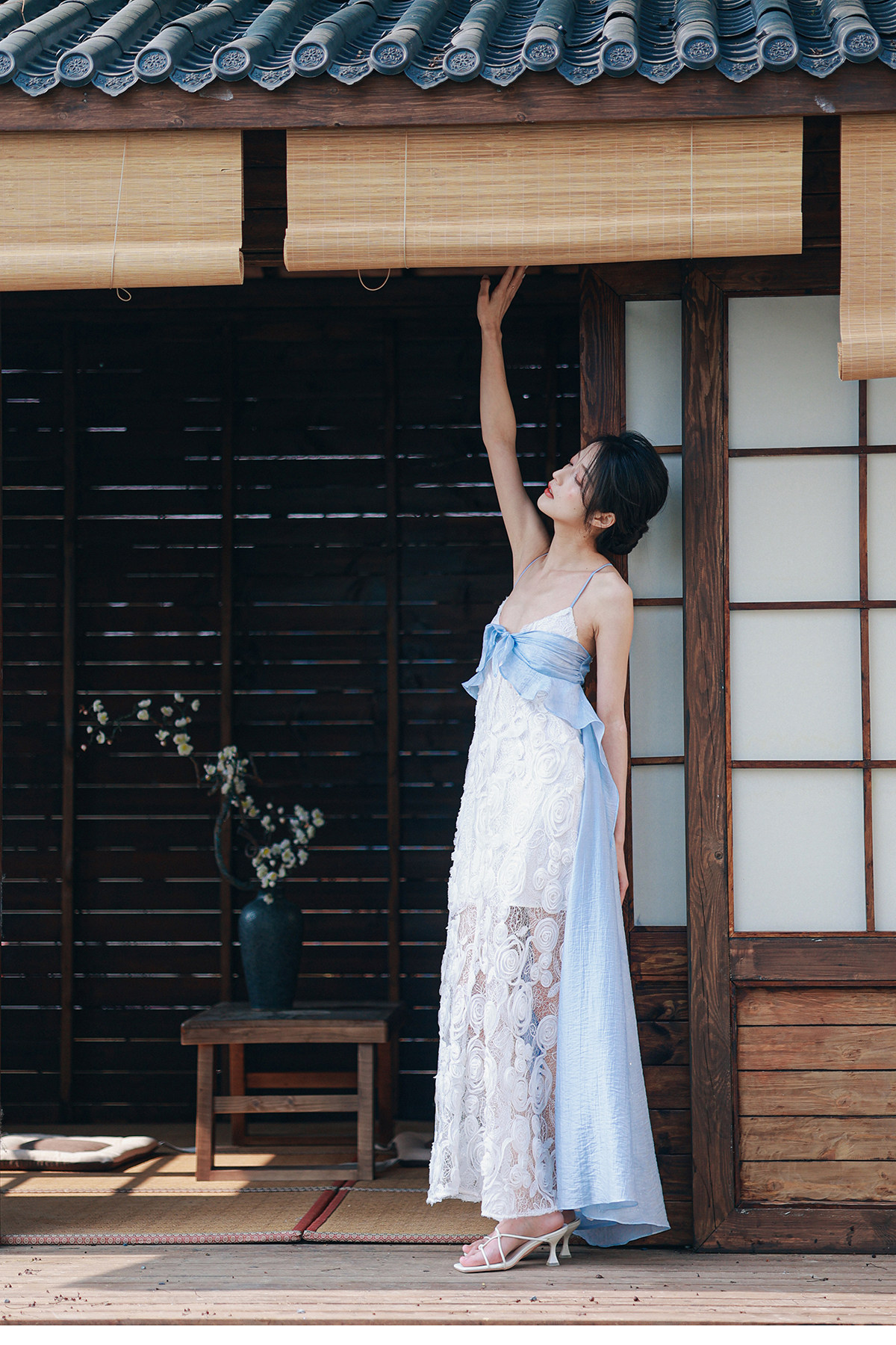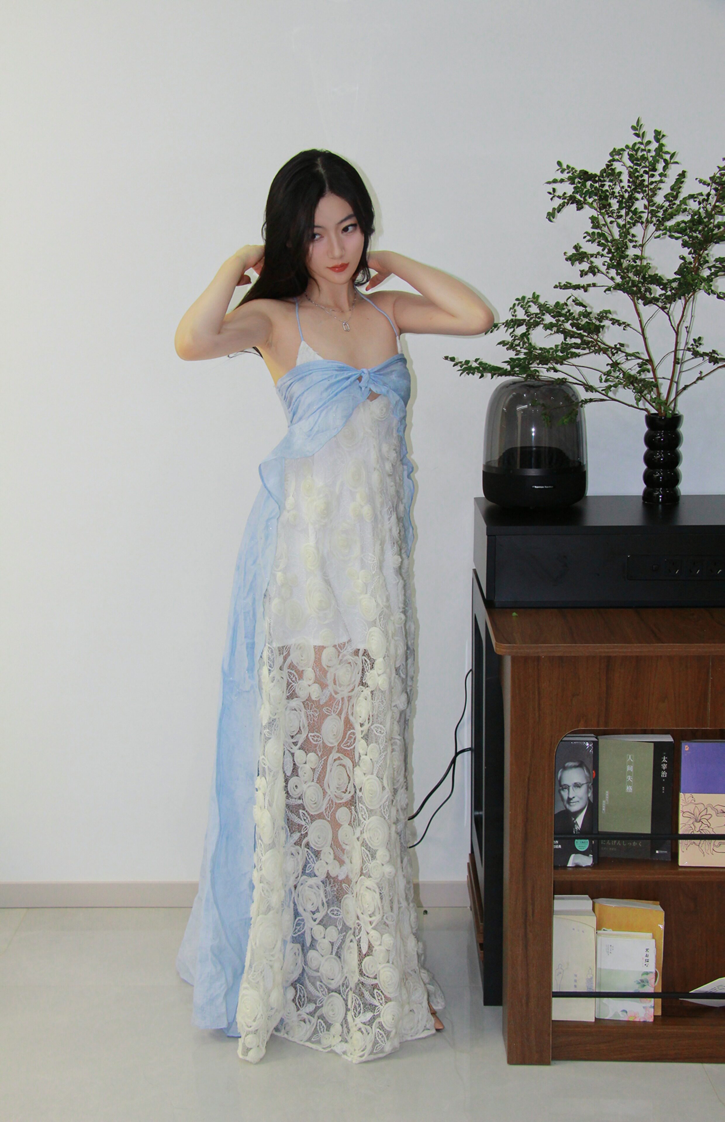 Moodxmiura платье сине -белая сетка розы сетка сплайсинга.