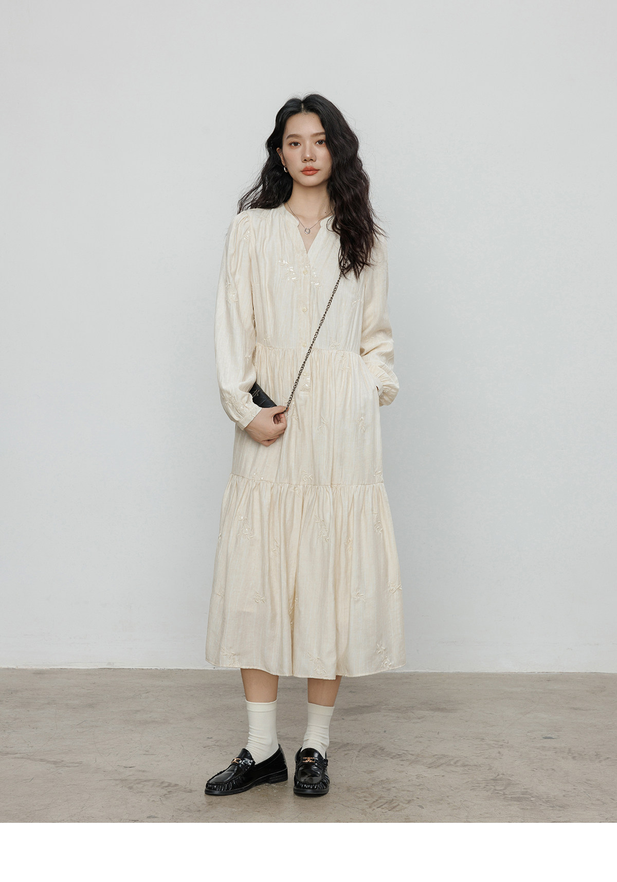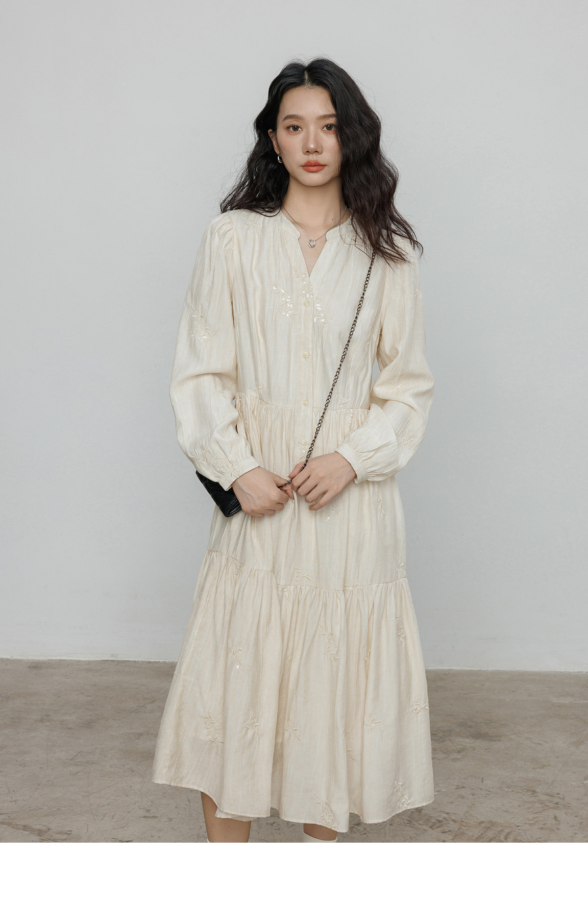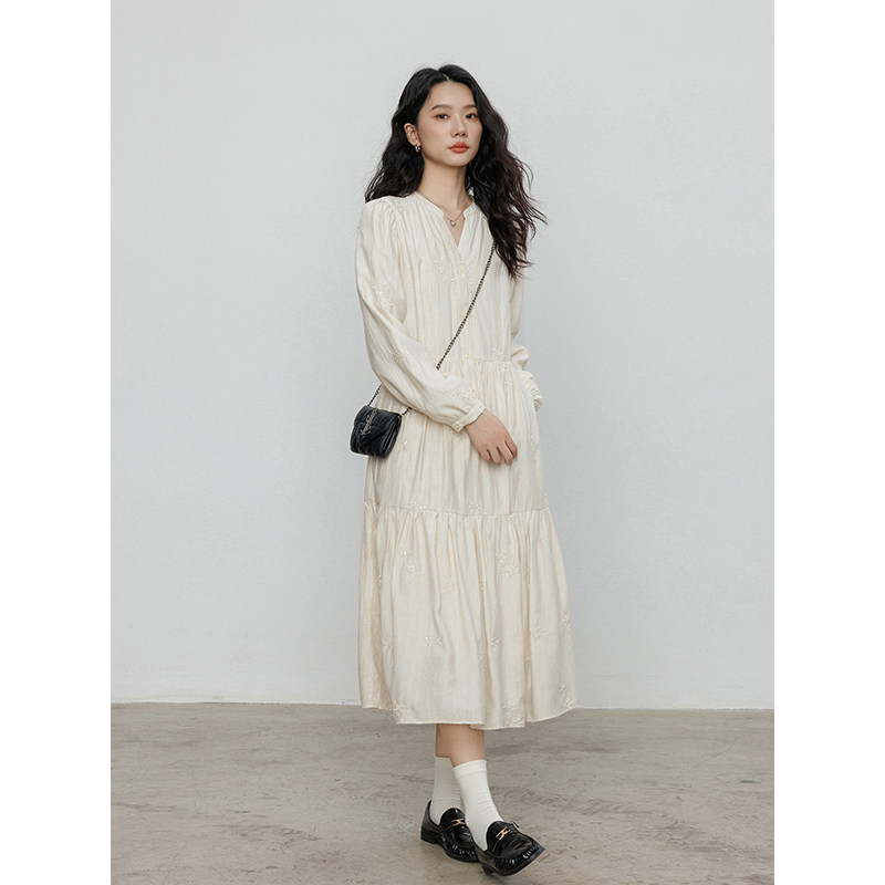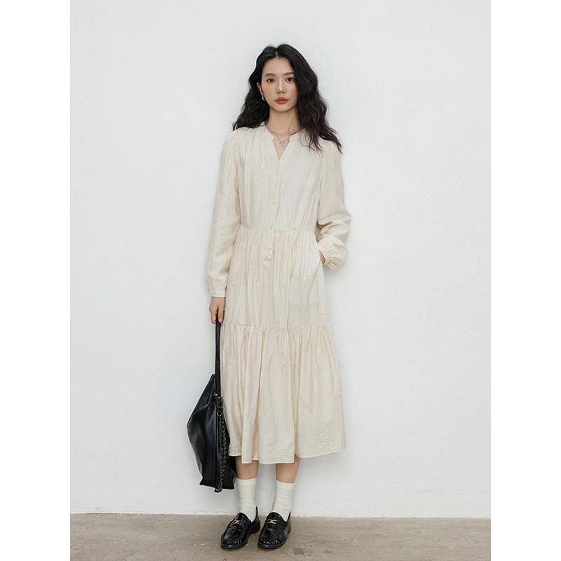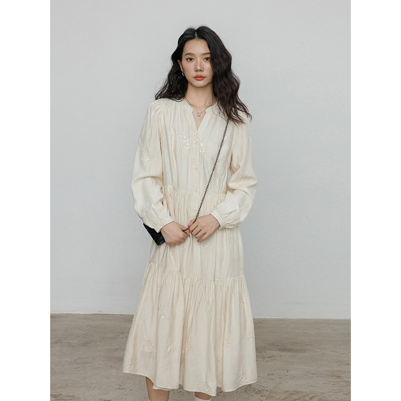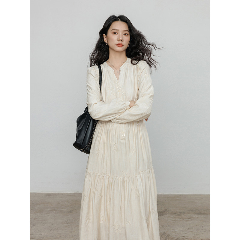 Лонгслив, дизайнерское платье, длинная юбка, V-образный вырез, с вышивкой, французский стиль, тренд сезона, А-силуэт