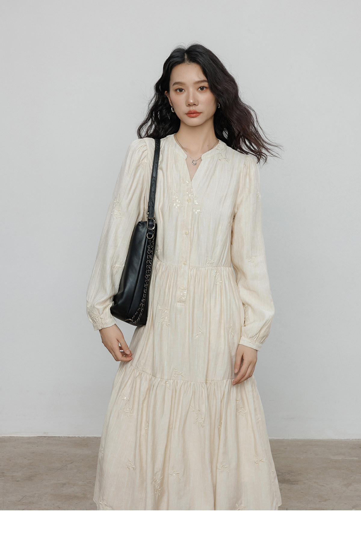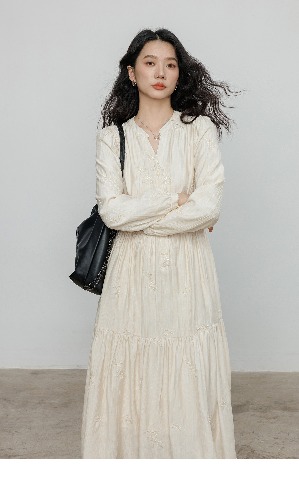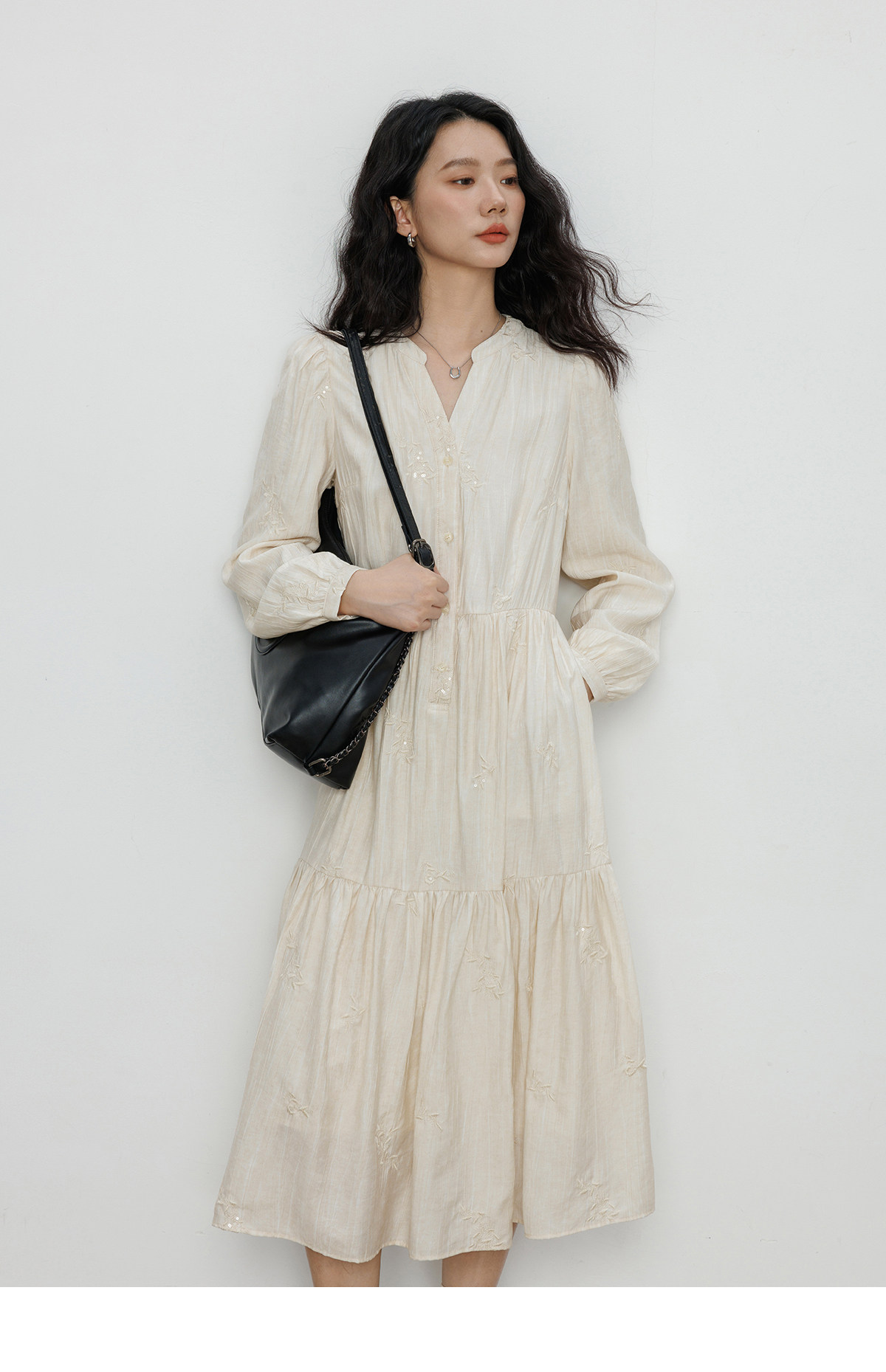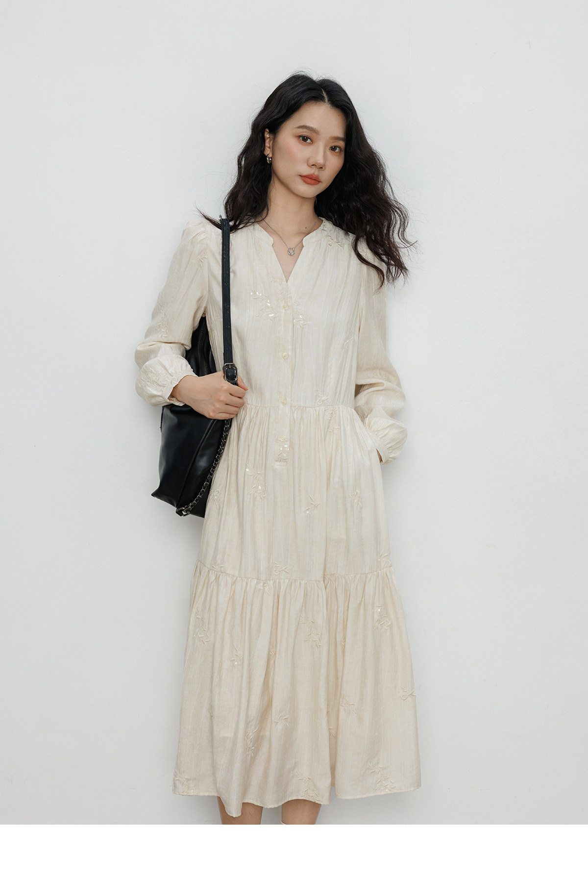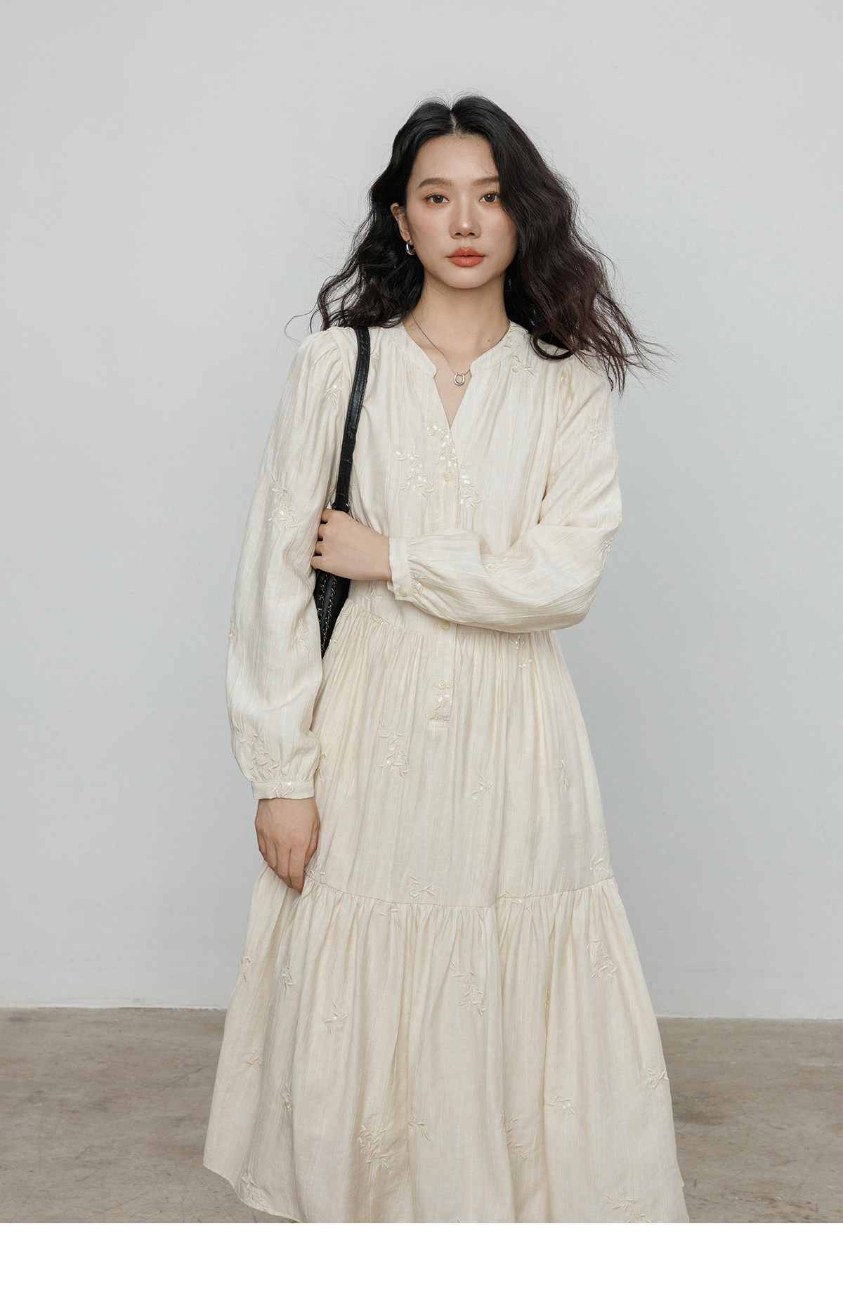 Лонгслив, дизайнерское платье, длинная юбка, V-образный вырез, с вышивкой, французский стиль, тренд сезона, А-силуэт