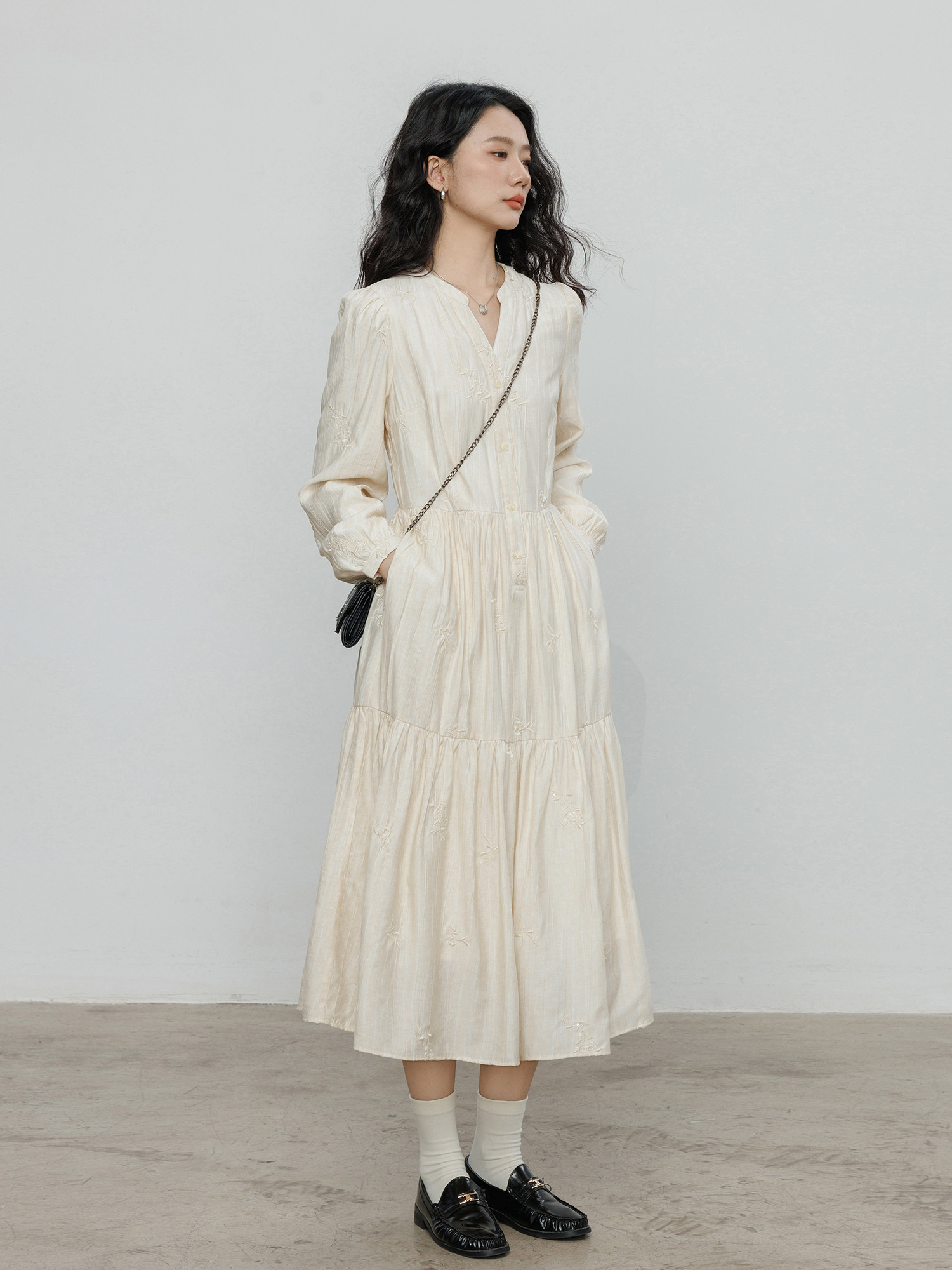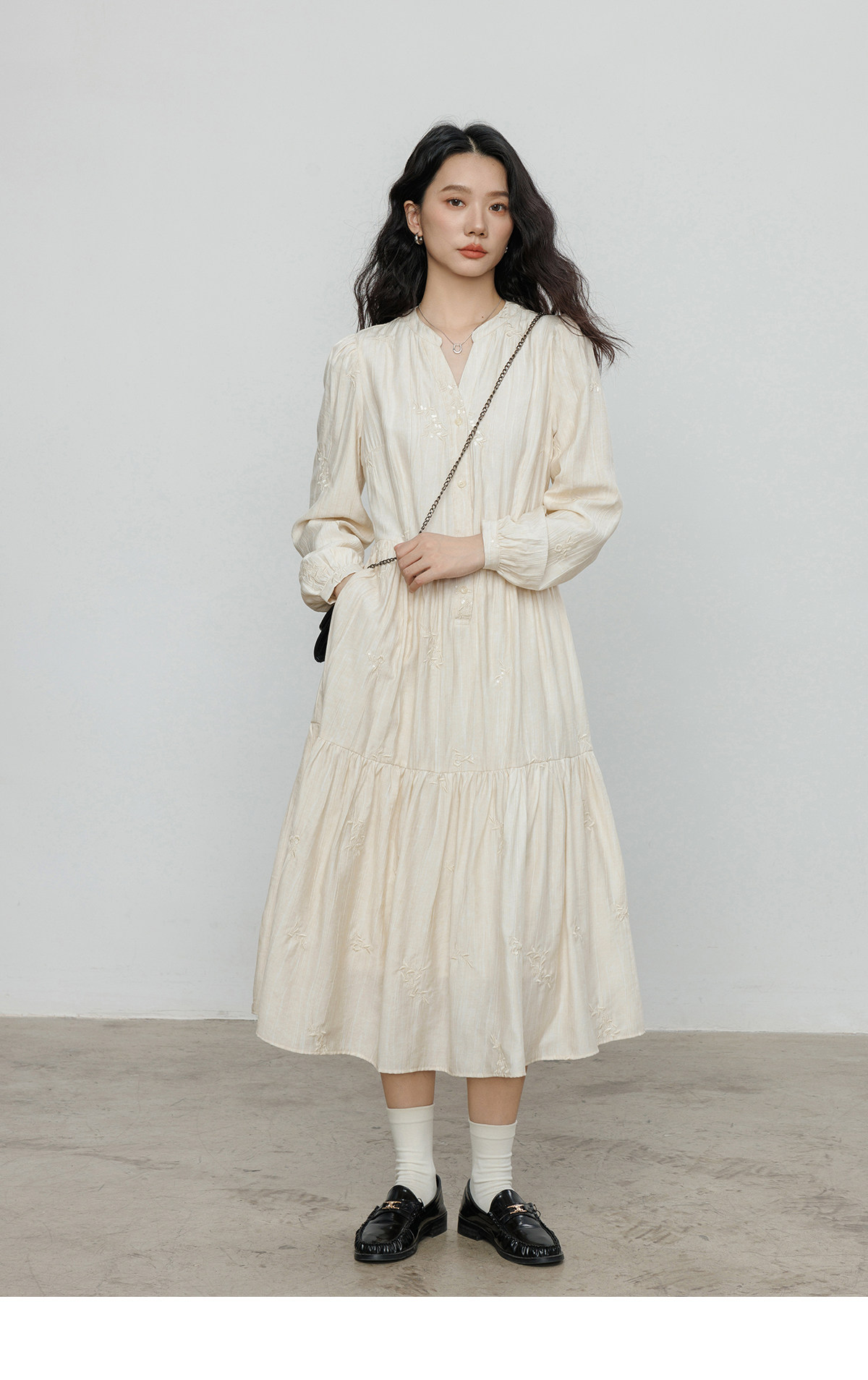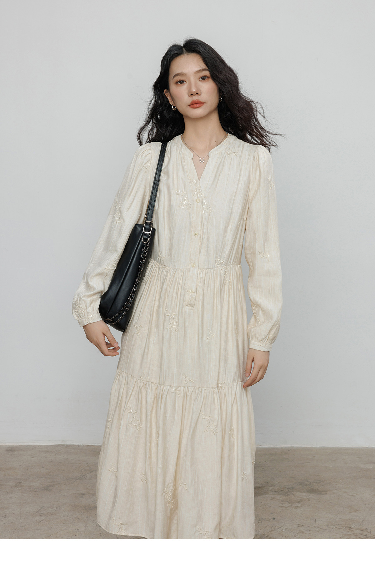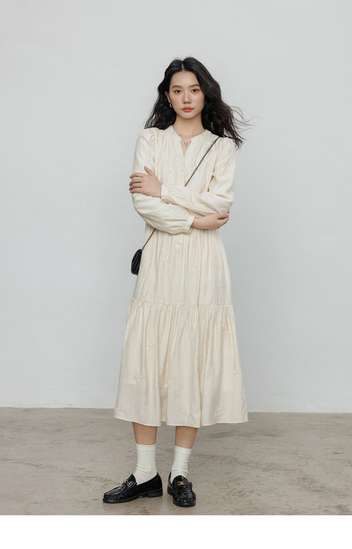 Лонгслив, дизайнерское платье, длинная юбка, V-образный вырез, с вышивкой, французский стиль, тренд сезона, А-силуэт