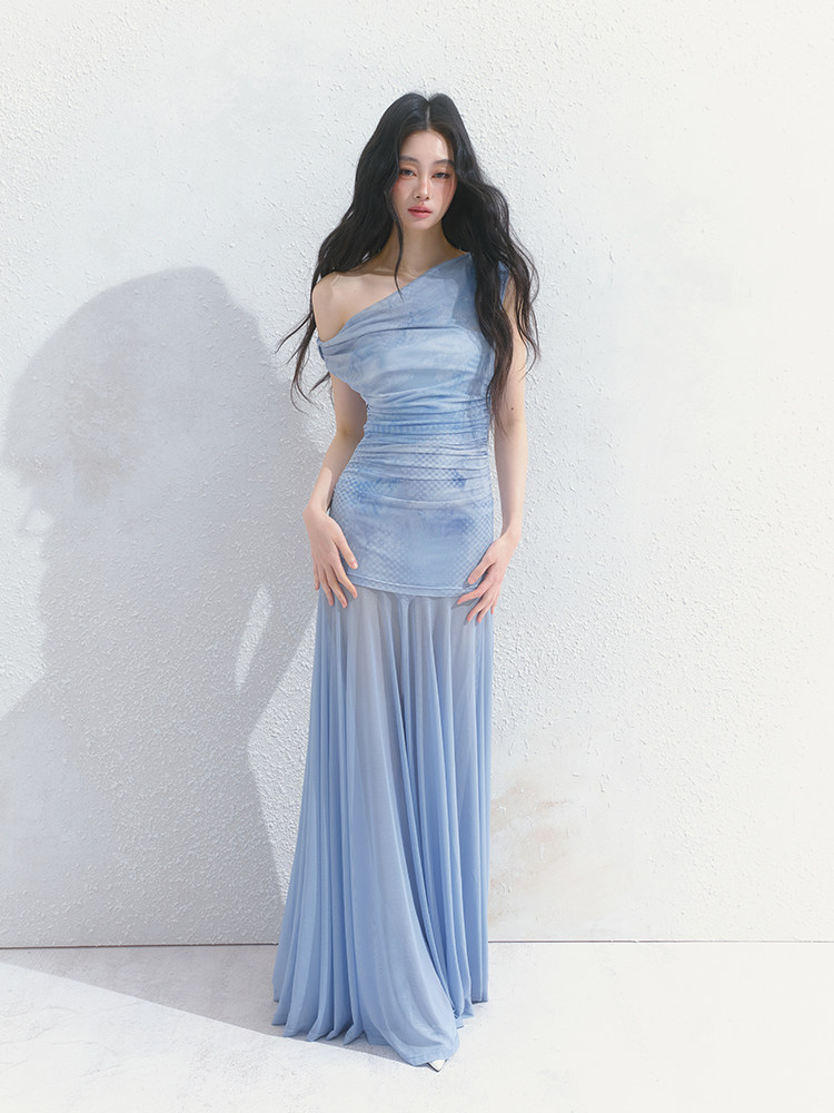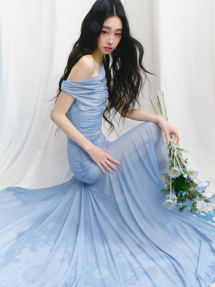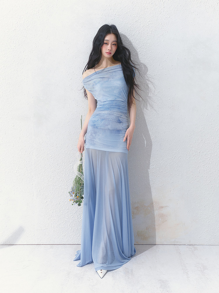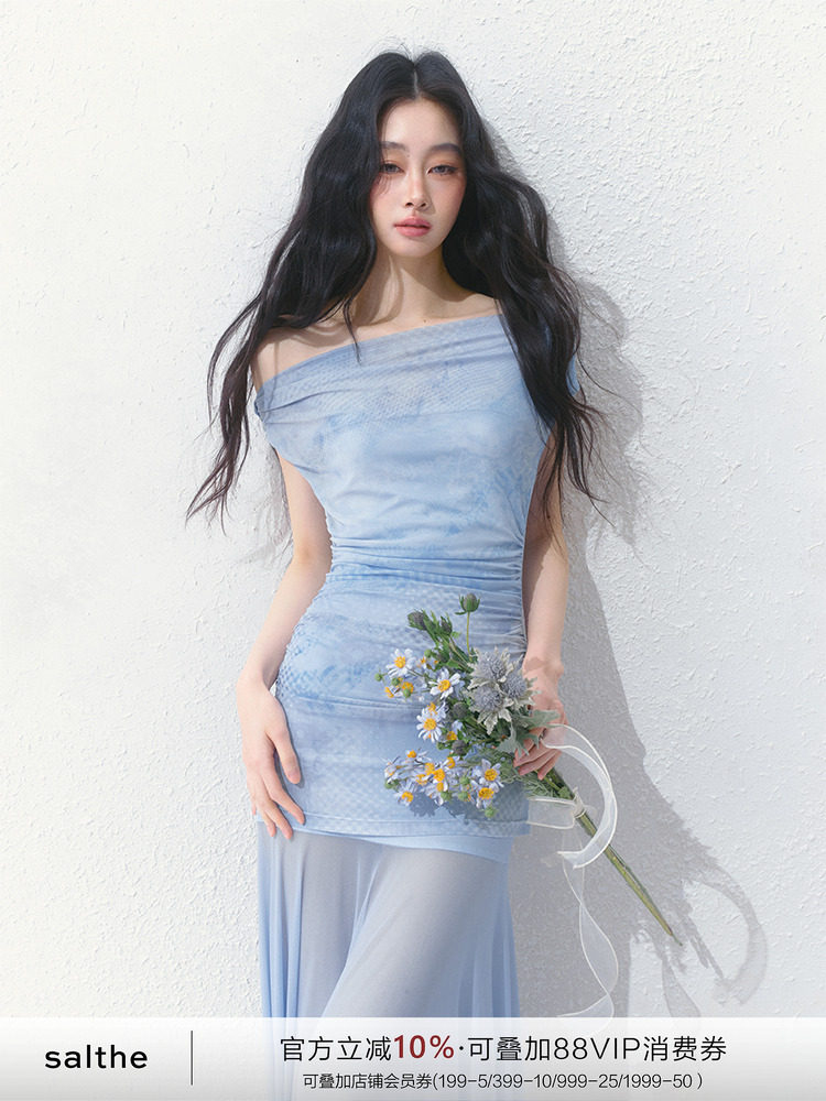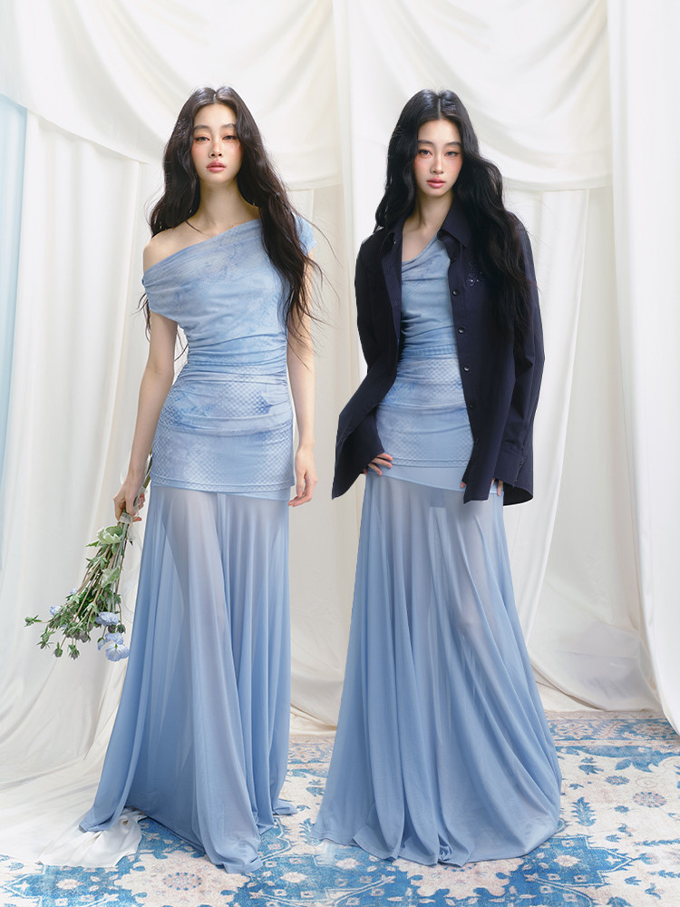 Salthe Salt Tea [Blue Blues] Оригинальная французская юбка из тюля с наклонными плечами и атмосферной слегка прозрачной юбкой А-силуэта