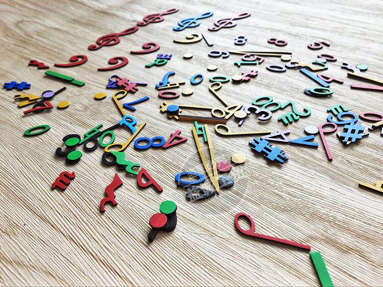 Пять -линейно -спектр магнитных учебных средств:Различные часто используемые простые заметки, примечания, символы покоя, числа съемки, небольшие линии секции, завершающие линии и другие часто используемые знаки, всего 25 видов, 260, магнитные, случайно разные цвета.