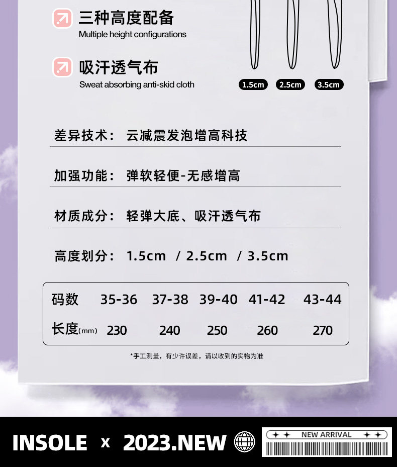 | Цвет: | 【1 пара】только для женщин ●Легкий, удобный и на 1,5 см выше., [1 пара] Только для женщин ●Легкий, удобный и на 2,5 см выше., 【1 пара】только для женщин ●Легкий и удобный, рост увеличивается на 3,5 см., 【2 пары】только для женщин ●Легкий и удобный, на 1,5 см выше., 【2 пары】только для женщин ●Легкий и удобный, на 2,5 см выше., 【2 пары】только для женщин ●Легкий и удобный, на 3,5 см выше., [Комбинированный набор из 2 пар] Легкая и мягкая эластичность | Одна пара с комфортным увеличением высоты на 1,5 + 2,5 см., [Комбинированный набор из 2 пар] Легкая и мягкая эластичность | Одна пара с комфортным увеличением высоты 2,5 + 3,5 см. |