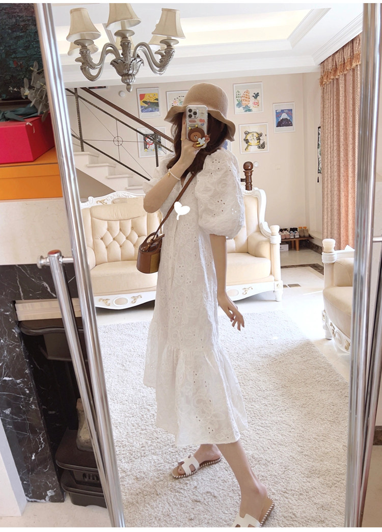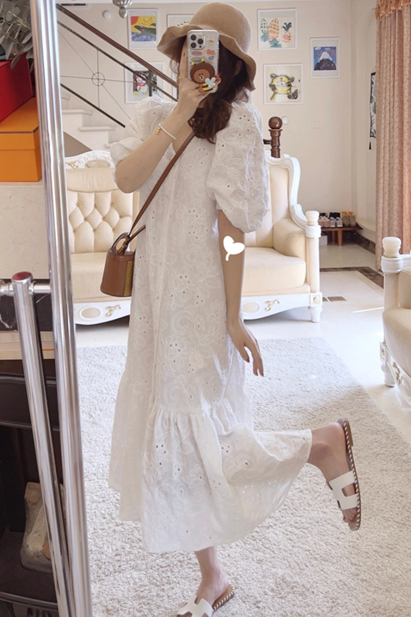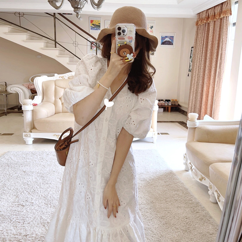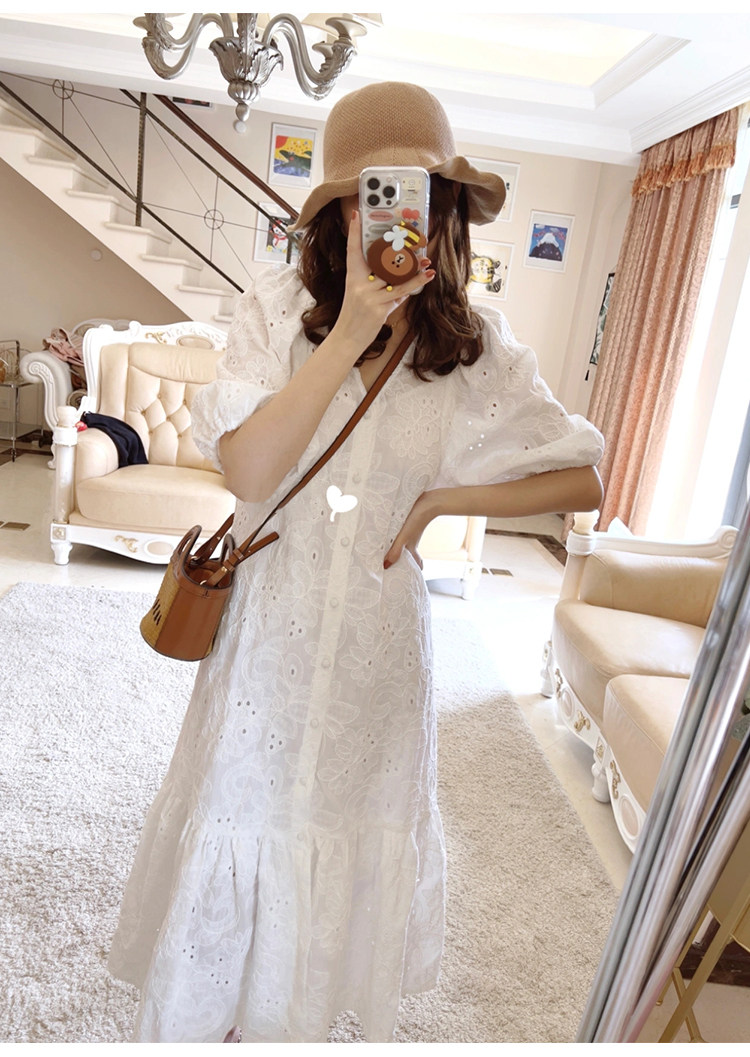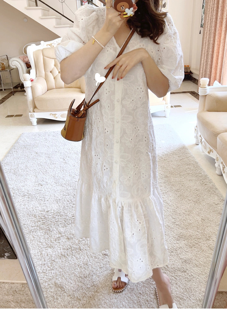 Летнее белое кружевное длинное платье, 2024 года, французский стиль, с вышивкой, V-образный вырез
