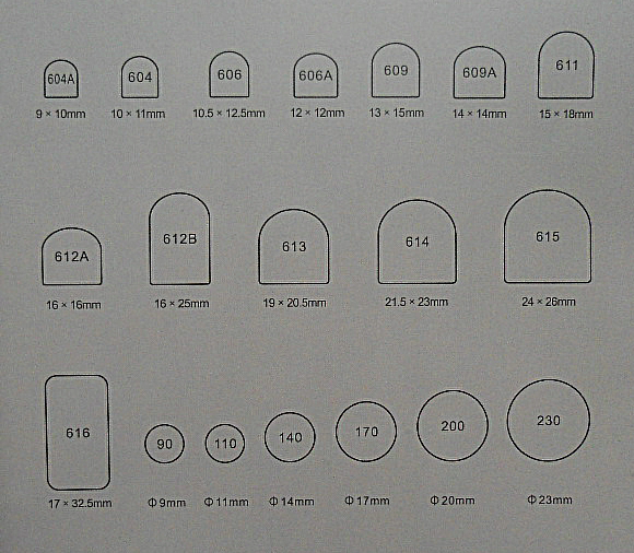 | Цвет: | 604A= 9*10mm, 604=10*11mm, 606=10.5*12.5mm, 606A=12*12mm, 609=13*15mm, 609A=14*14mm, 611=15*18mm, 612A=16*16mm, 612B=16*25mm, 613=19*20.5mm, 614=21.5*23mm, 615=24*26mm, 616=17*32.5mm, Диаметр 9мм, Диаметр 11мм, Диаметр 14мм, Диаметр 17мм, 604B=11*11mm, 606C=13*13mm, [Нижняя версия шаблона меняется, никакого другого уведомления], 500 = круглый диаметр 8 мм, 509= 9*9mm, 601a = круглый диаметр 12 мм |