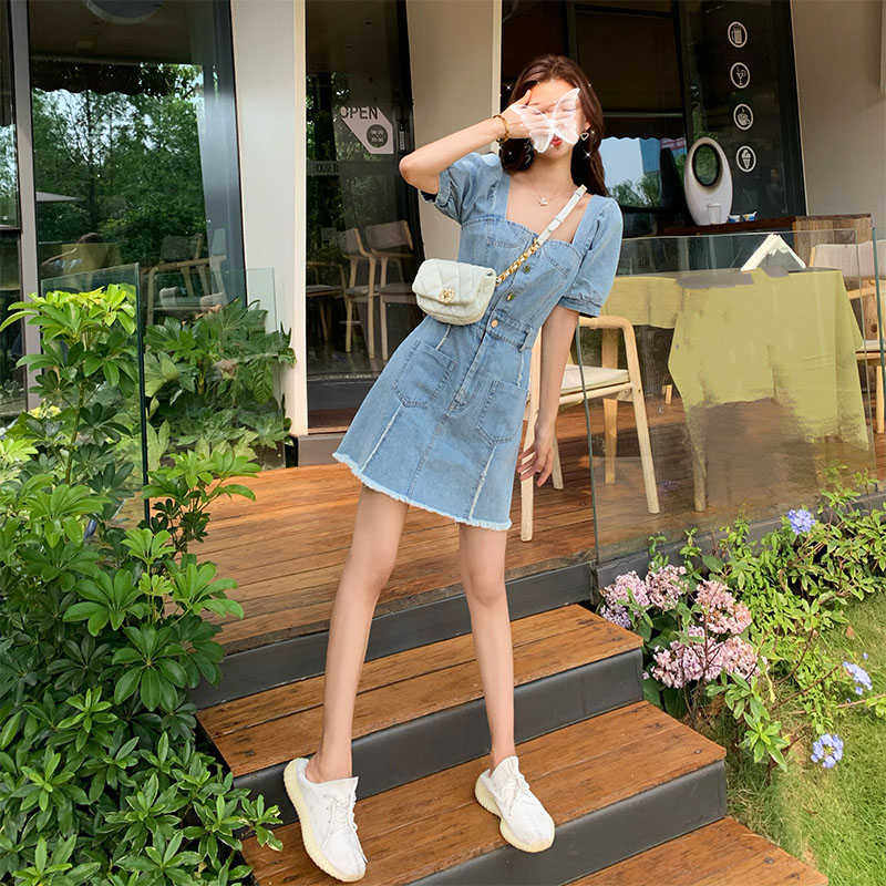 Джинсовое платье, большой размер, коллекция 2022, французский стиль, рукава фонарики, яркий броский стиль, квадратный вырез