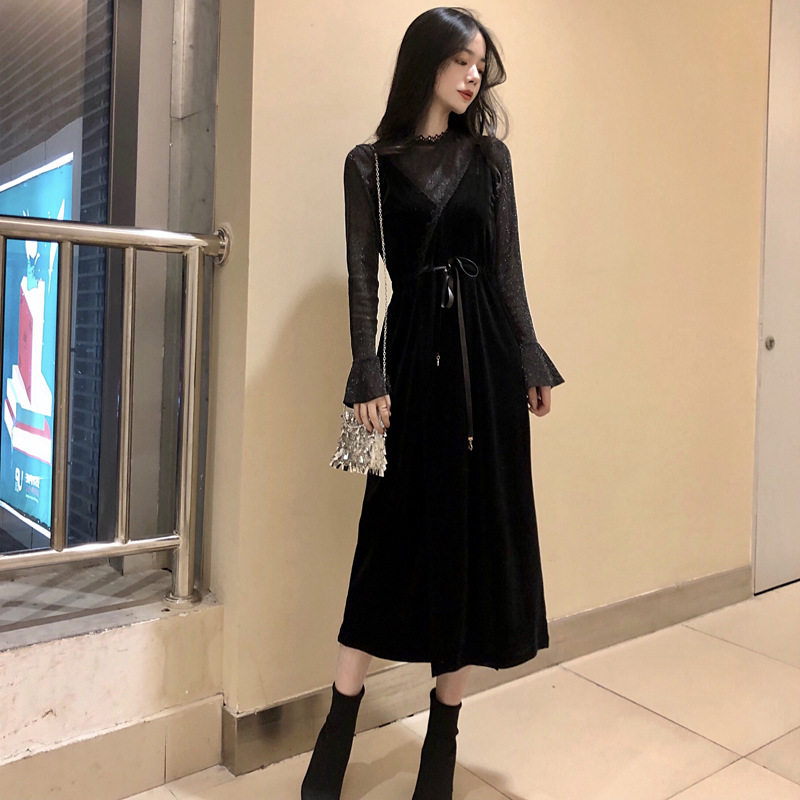 Черное платье, комплект, приталенный корсет, лонгслив, длинная юбка, легкий роскошный стиль