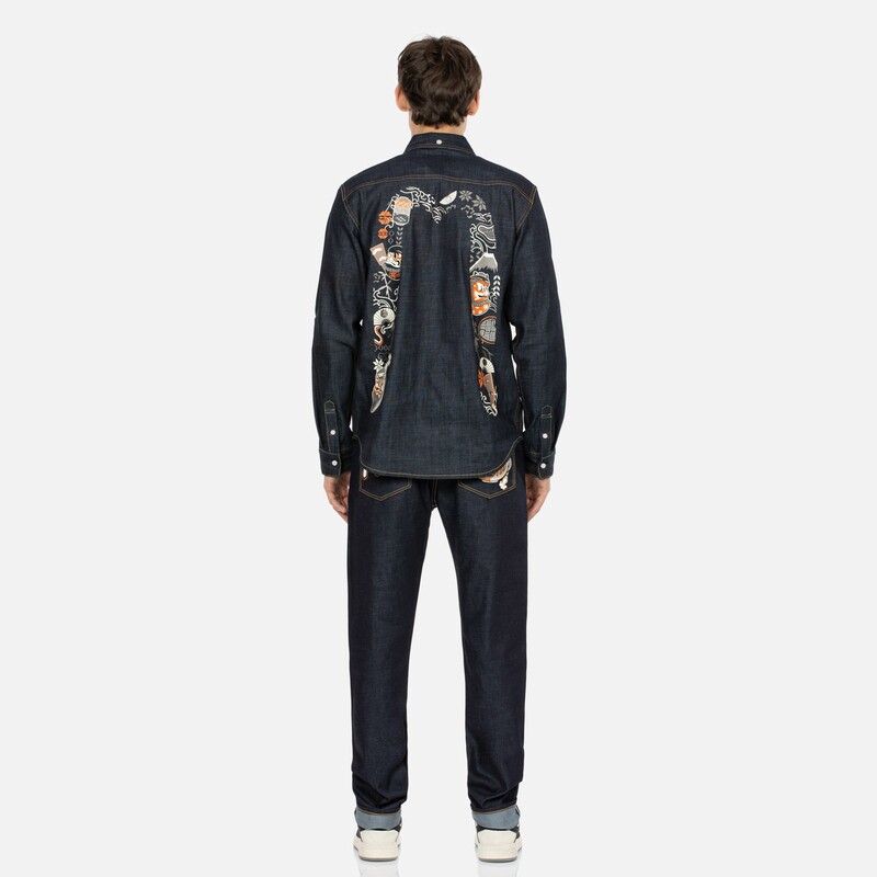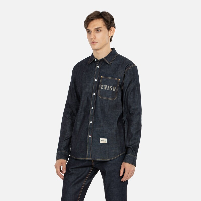 Мужская модная синяя джинсовая куртка-рубашка с длинными рукавами EVISU Daruma big M с принтом 2EAHTM3SL1041XXDN