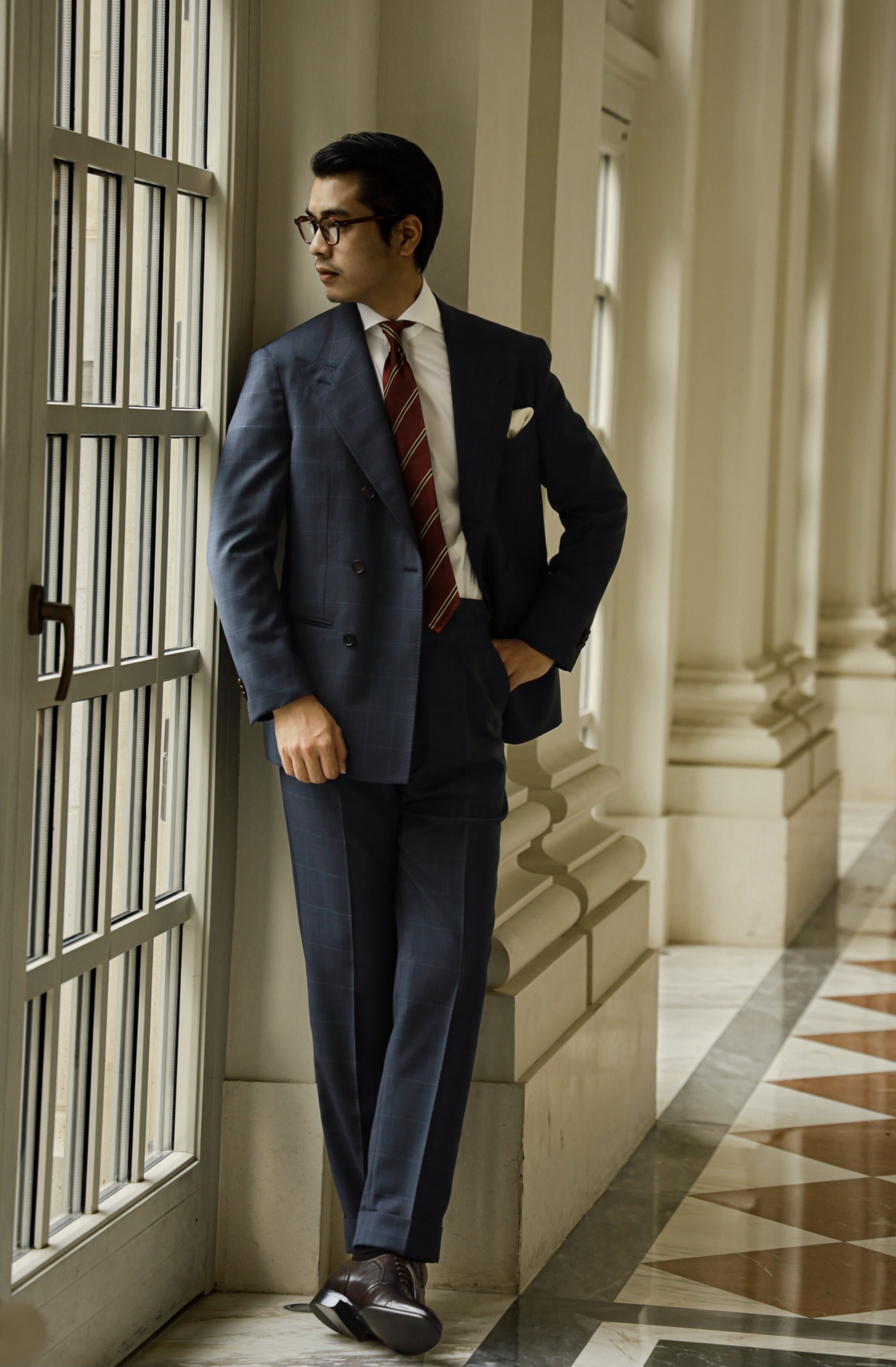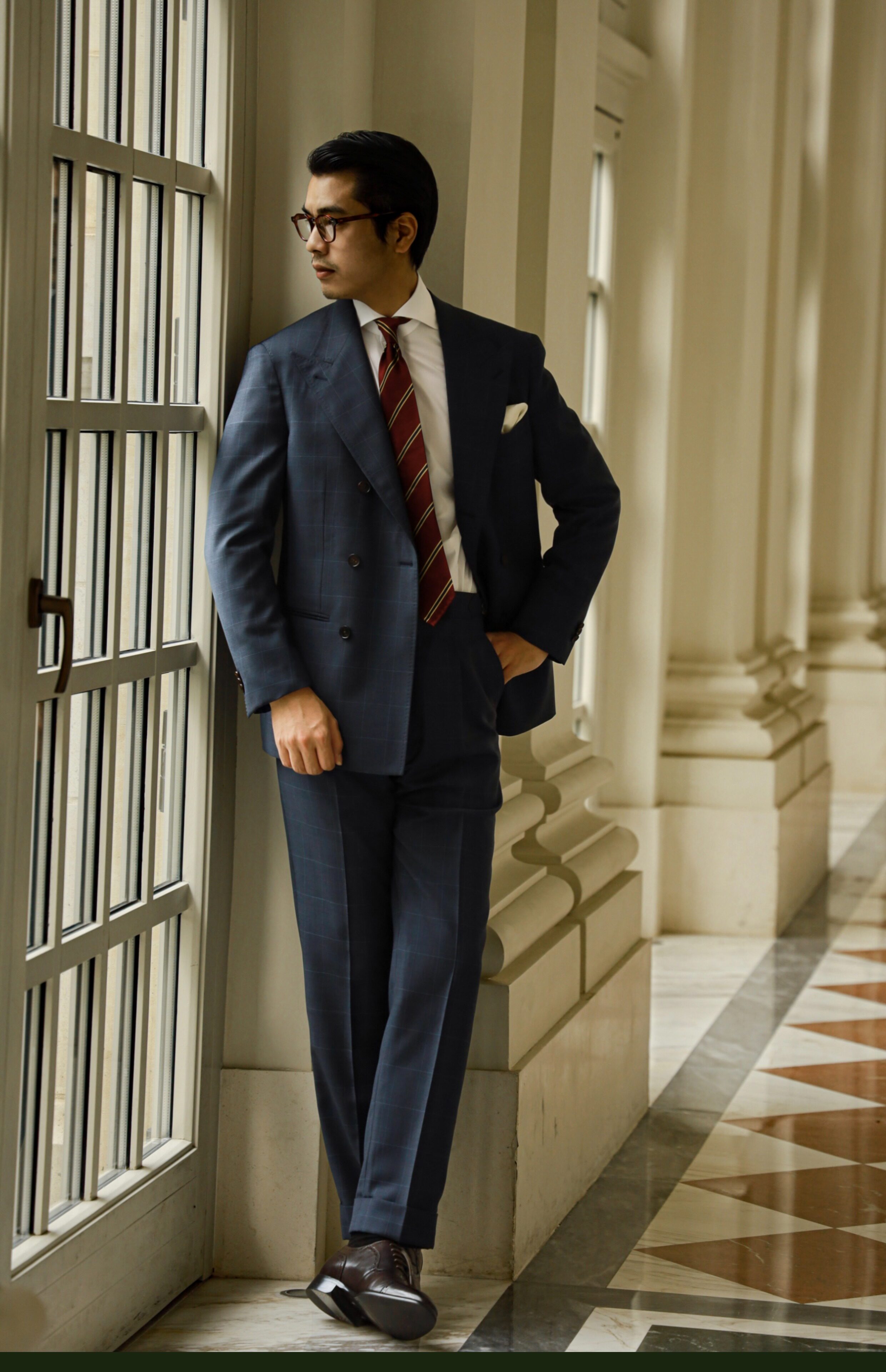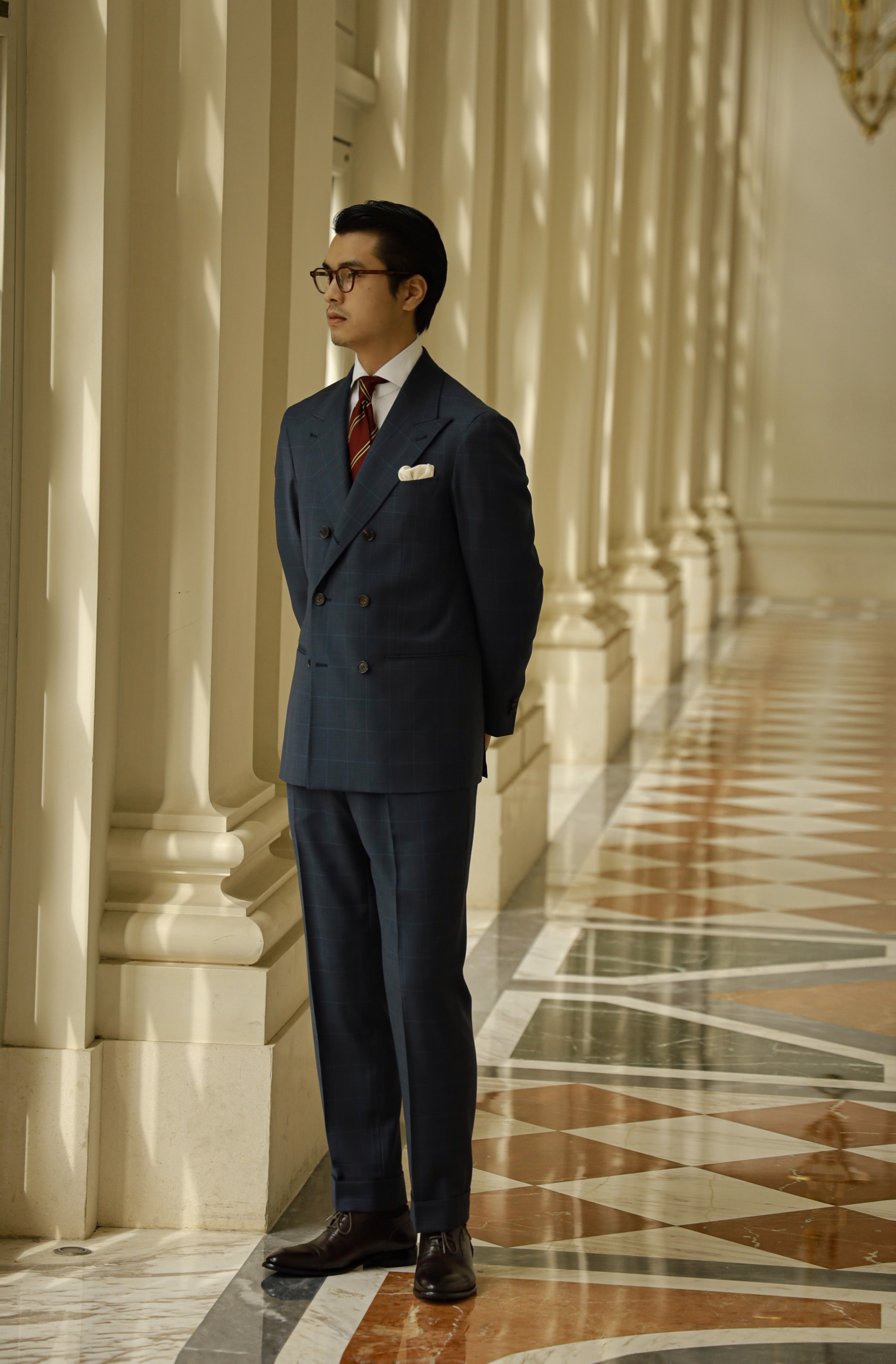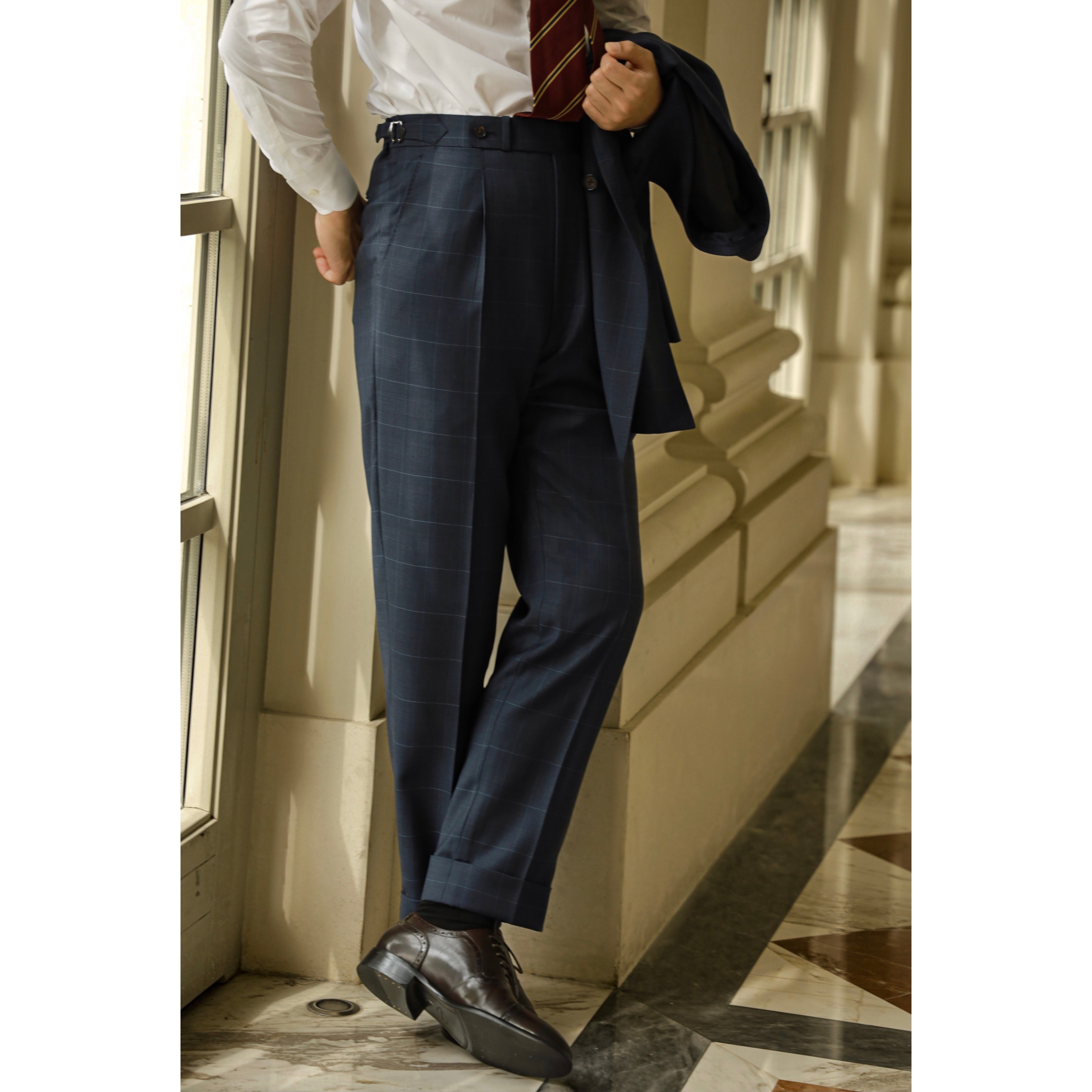 [Модель благосостояния] Мастерство высокой моды из цельной шерсти, синяя клетка в голубую клетку, мужские брюки с высокой талией на пуговицах в итальянском стиле.