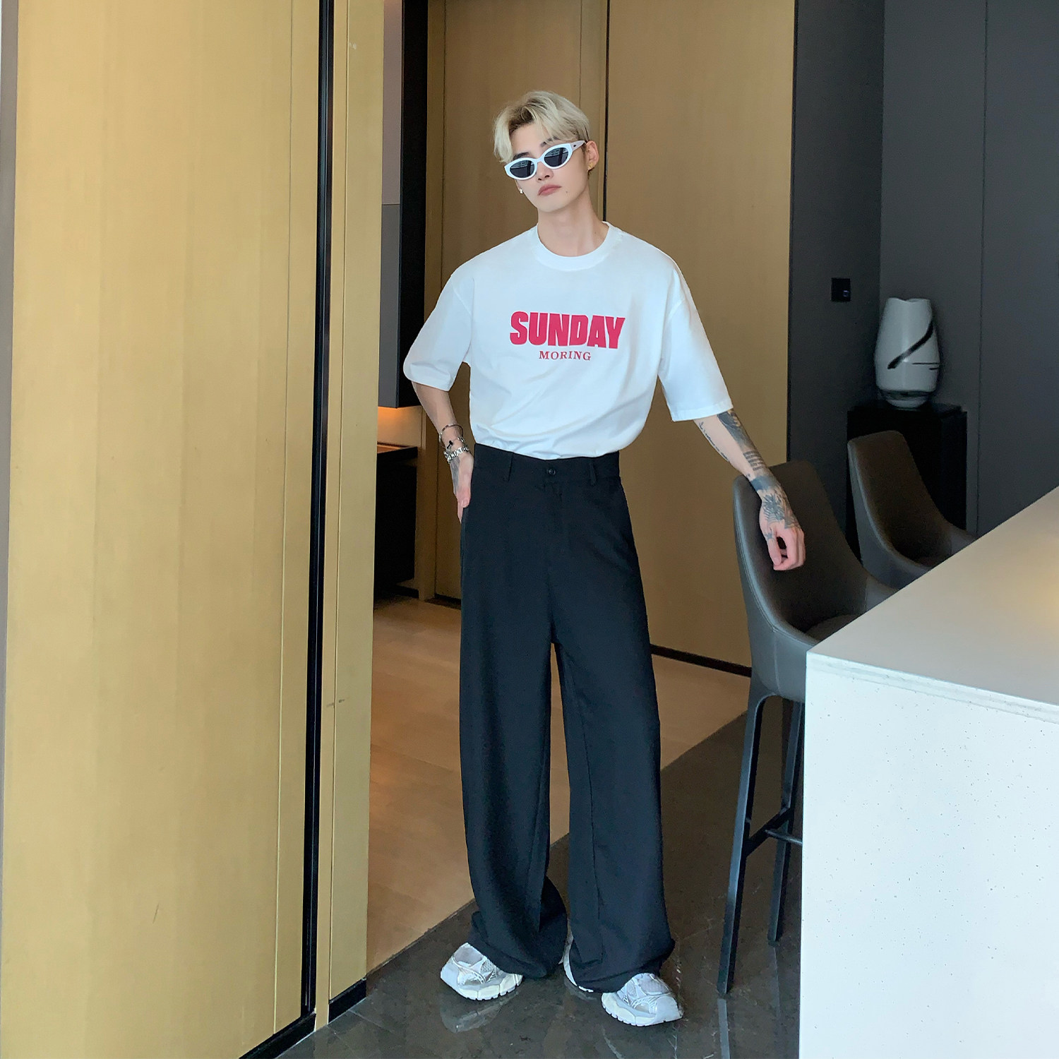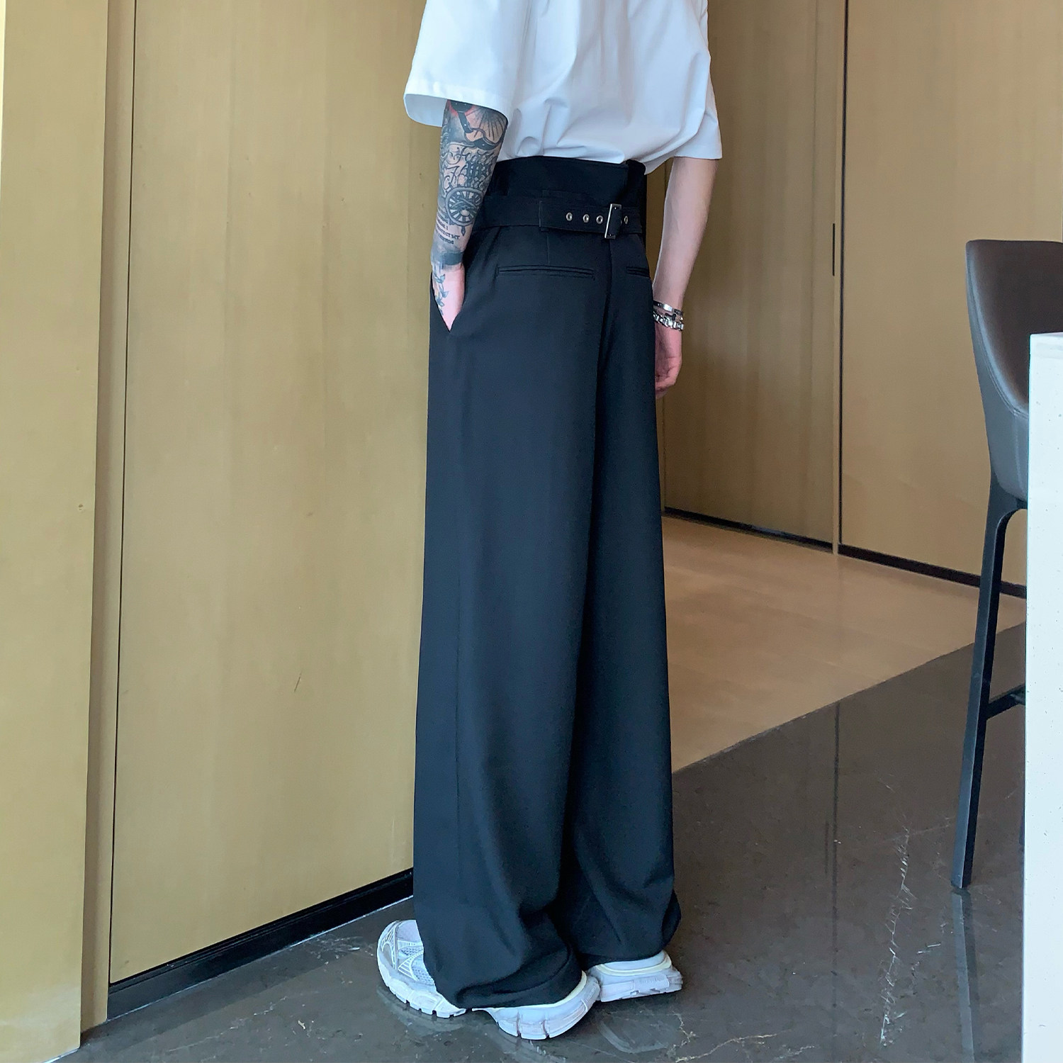 Небольшой дизайнерский костюм, штаны, тренд сезона, высокая талия, свободный прямой крой, оверсайз