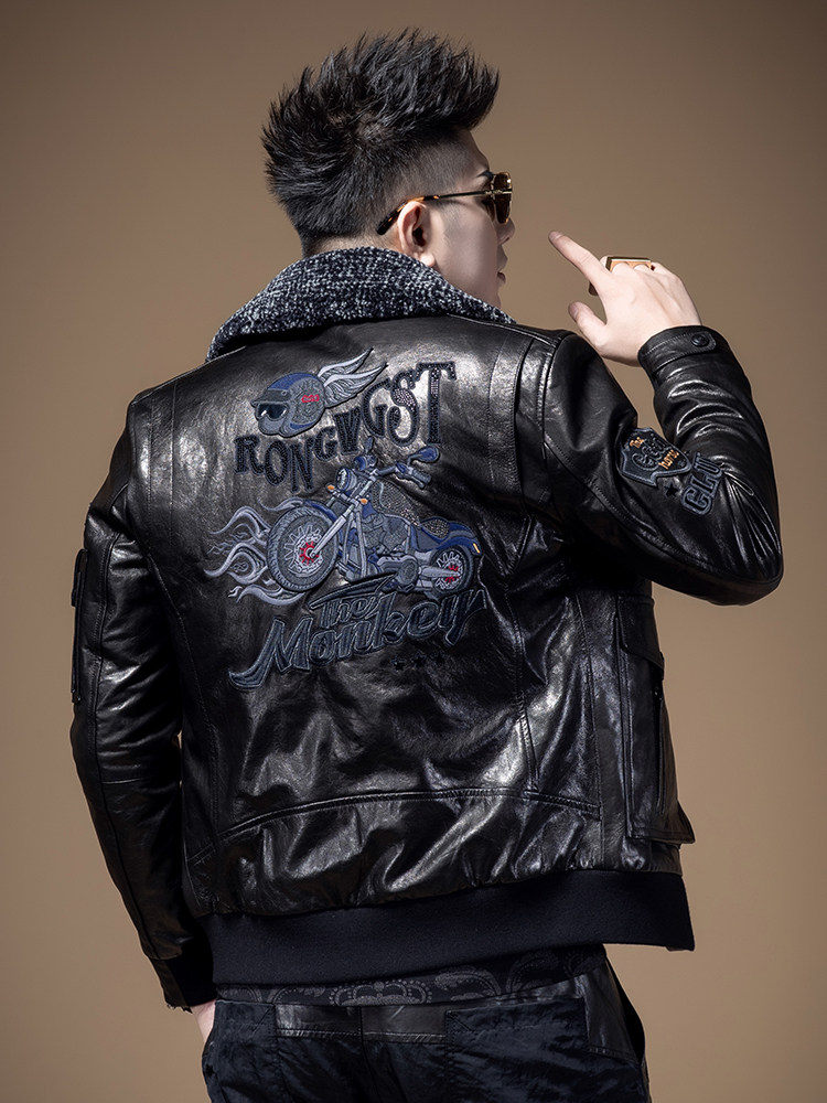 Элитный короткий пуховик, куртка, с вышивкой, из натуральной кожи