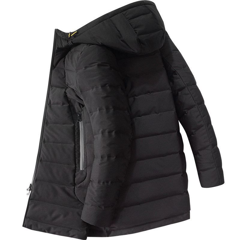 Длинный зимний трендовый пуховик для мальчиков, черная удерживающая тепло шапка с капюшоном, куртка, облегающий крой