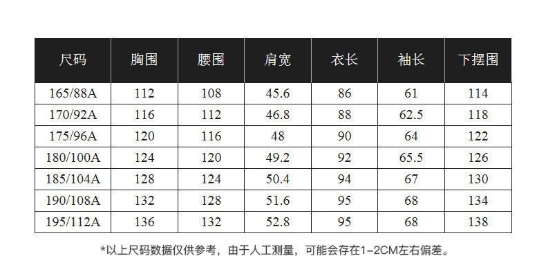 | Размер: | 165/88A/S, 170/92A/M, 175/96A/L, 180/100A/XL, 185/104A/XXL, 190/108A/XXXL, 195/112A/XXXXL |