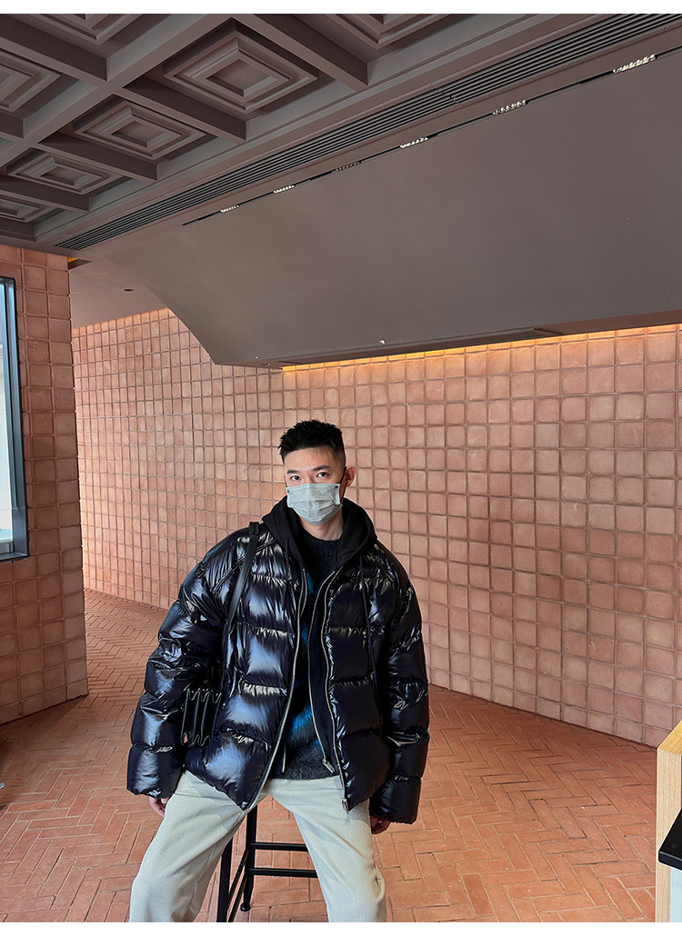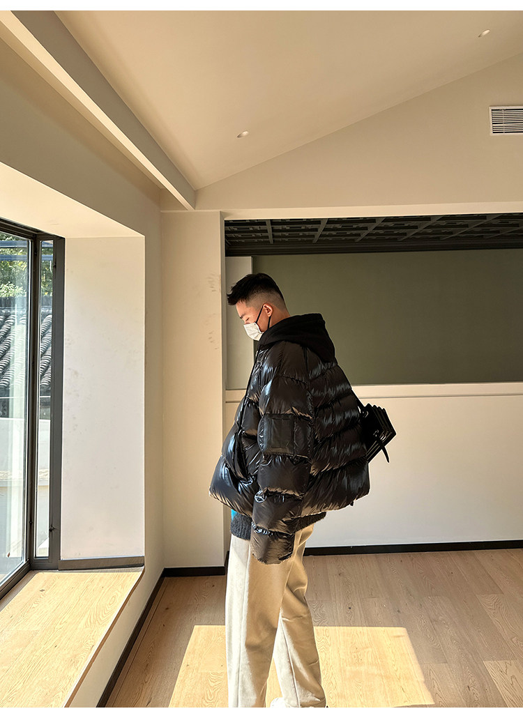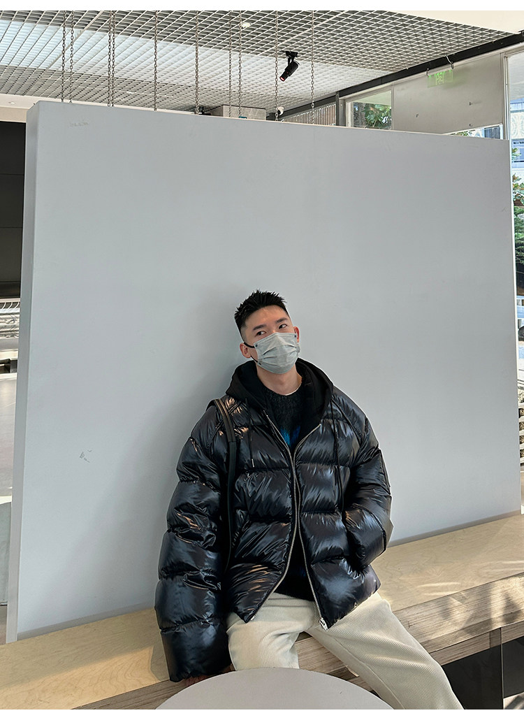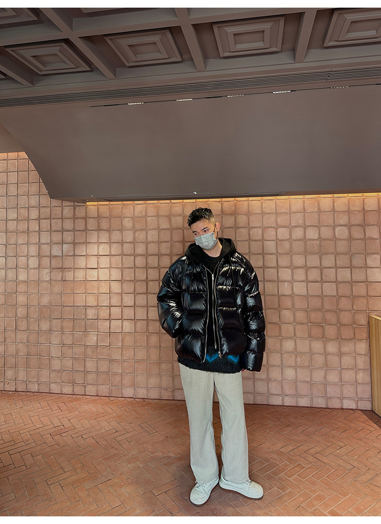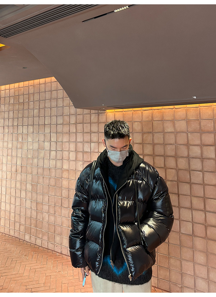 Черный глянцевый короткий зимний пуховик с капюшоном, куртка, гусиный пух, увеличенная толщина, для влюбленных