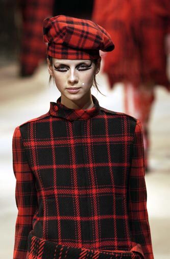 В середине шоу появились четыре стиля красной клетчатой одежды.Они привлекали внимание, а затем быстро исчезали. Шоу вернулось в черно-белый мир «гусиных лапок».