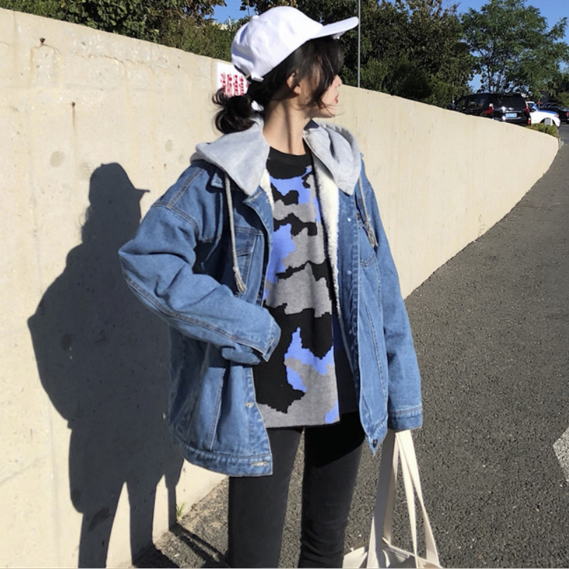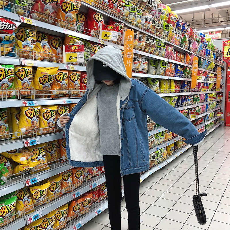 Флисовая джинсовая зимняя куртка, пуховик с капюшоном, увеличенная толщина, свободный крой, коллекция 2021, в корейском стиле