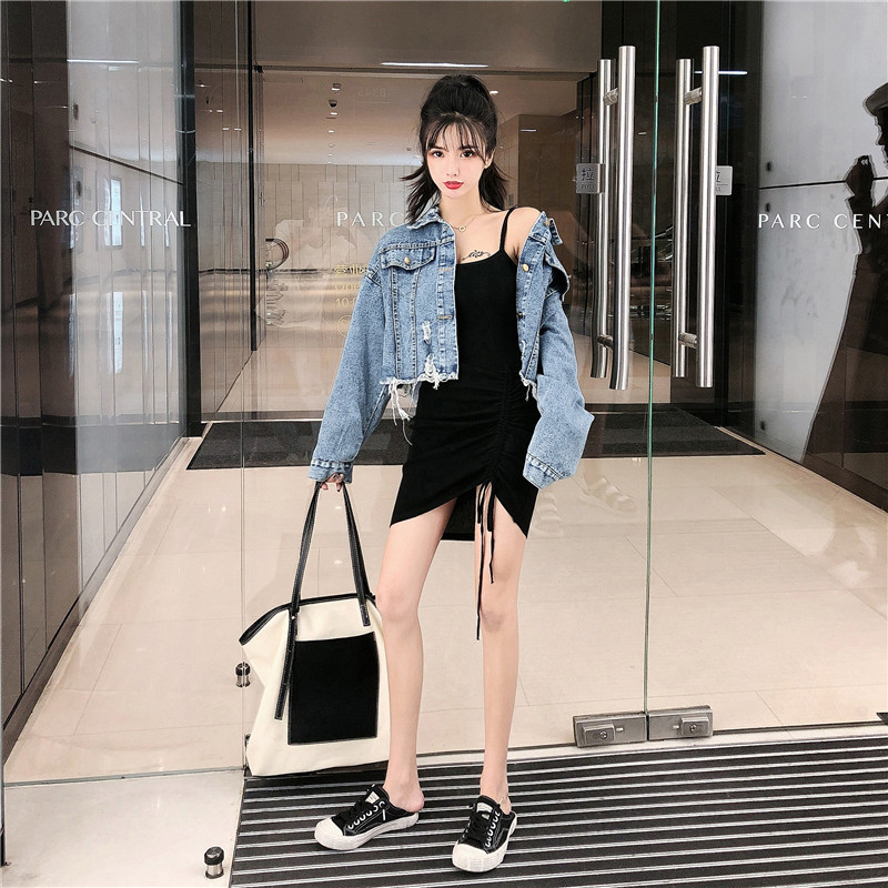 Весенняя джинсовая юбка, куртка, трикотажная майка, платье-комбинация, комплект, 2020, облегающий крой
