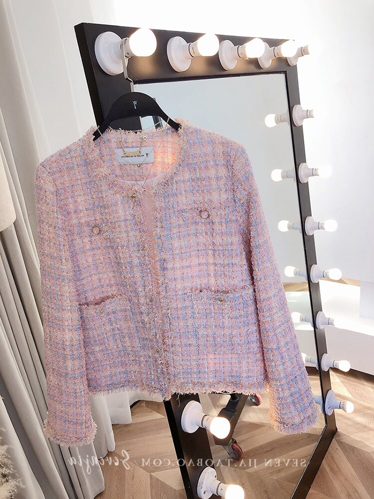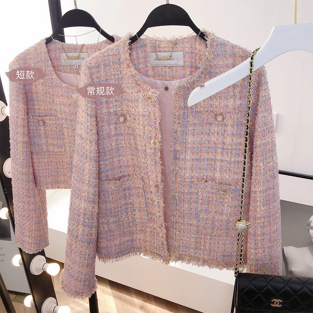 Розовая осенняя куртка, плетеный кардиган с круглым воротником, в стиле Шанель