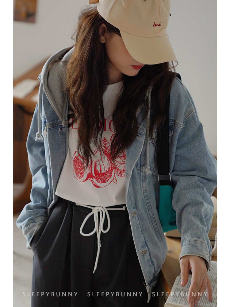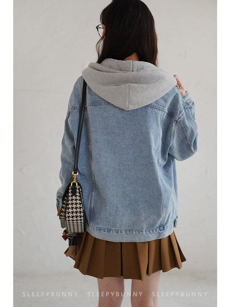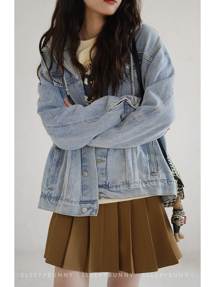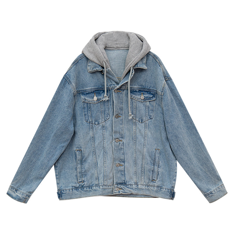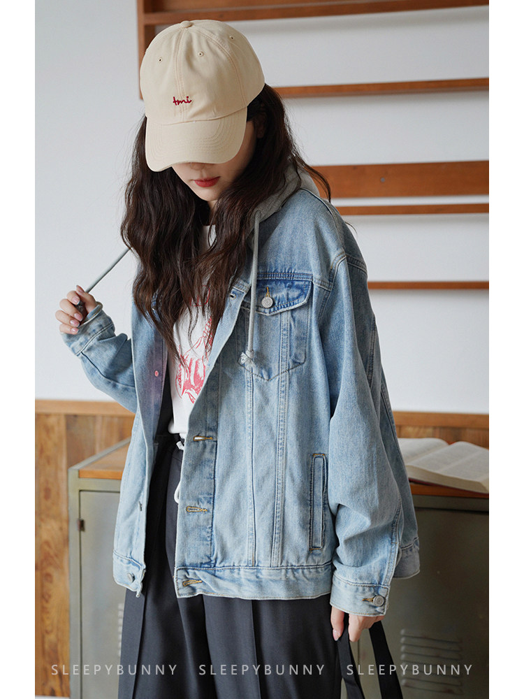 Джинсовый комплект, осенняя ретро куртка для отдыха с карманами с капюшоном, оверсайз