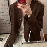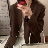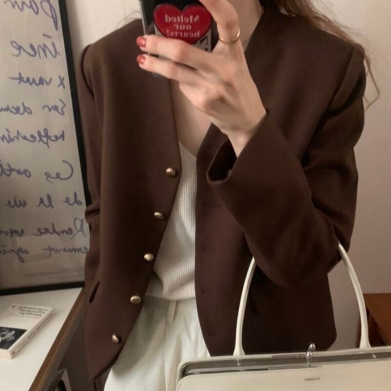 Демисезонный ретро металлический коричневый короткий костюм, пиджак классического кроя, в корейском стиле, V-образный вырез