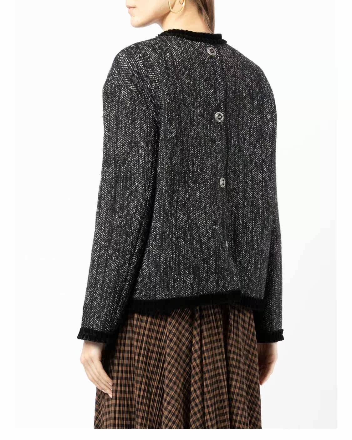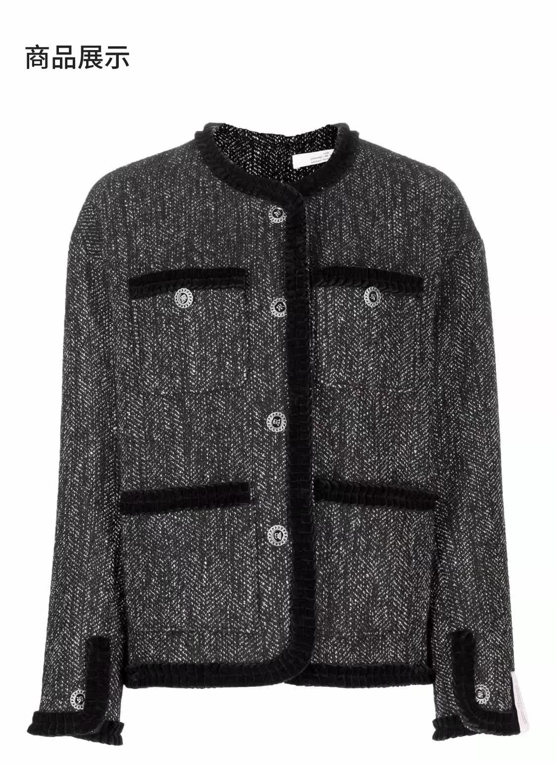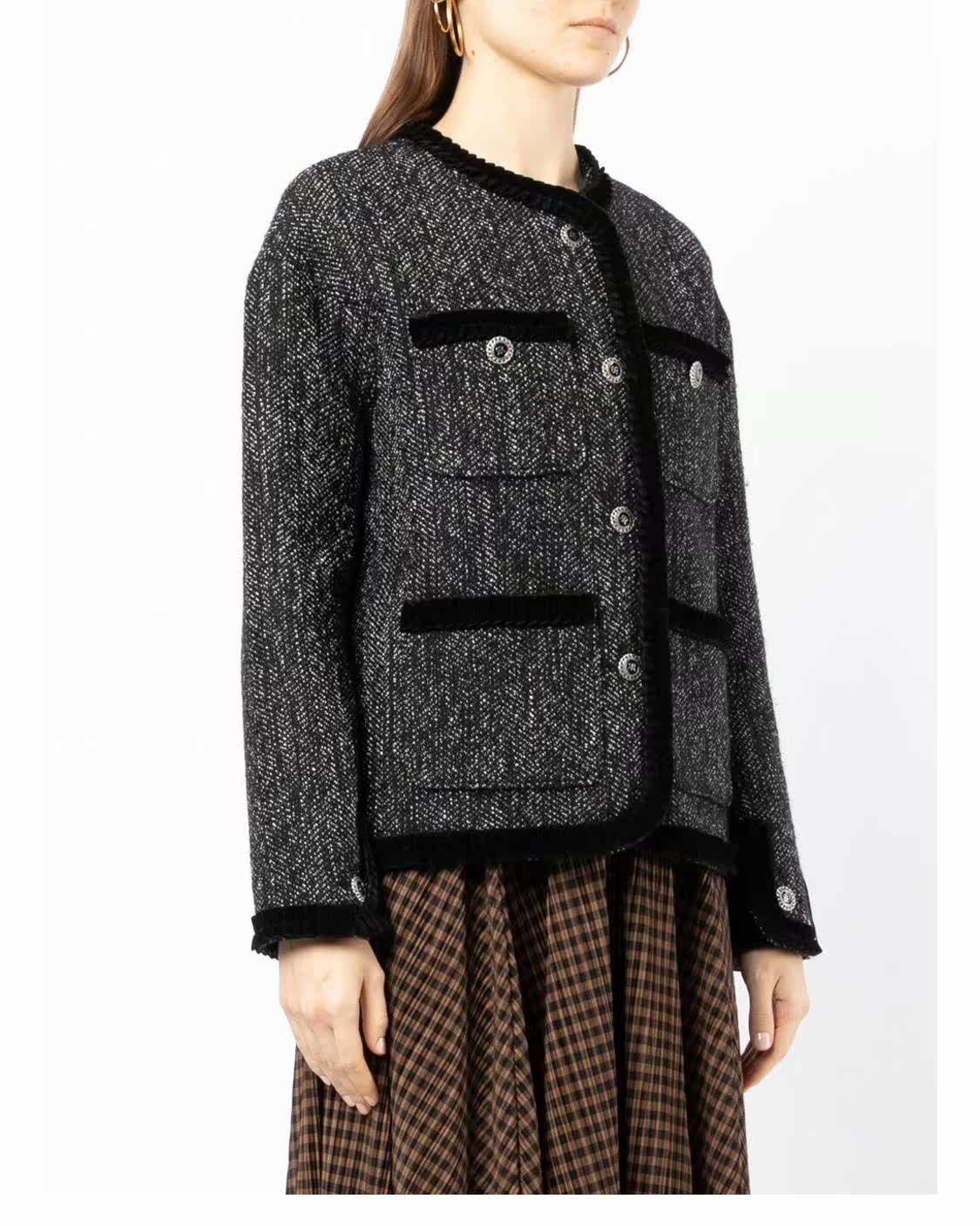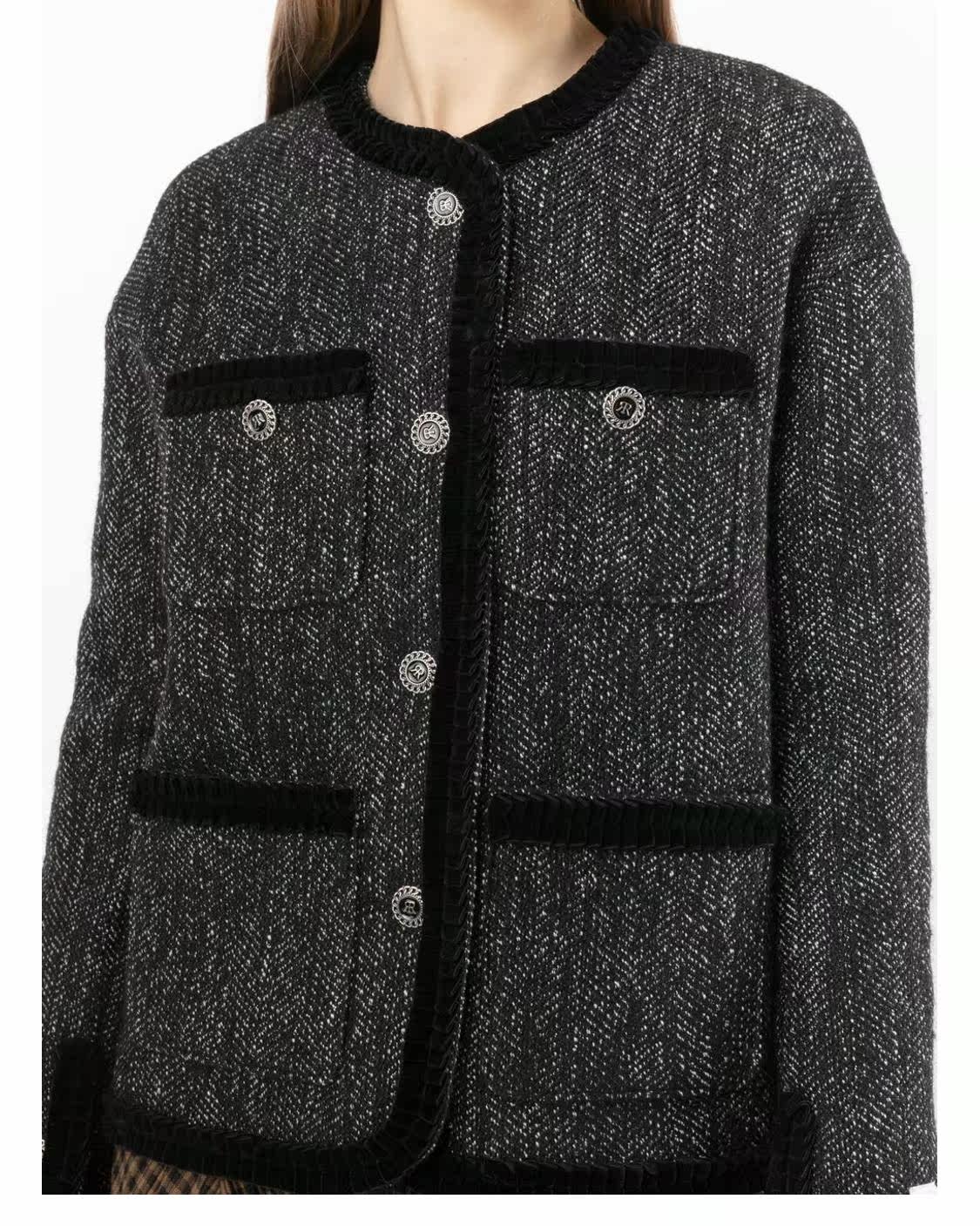 Рох, мисс Рох, нажимая кнопку Подробности грубых цветов, куртки, задумчивый