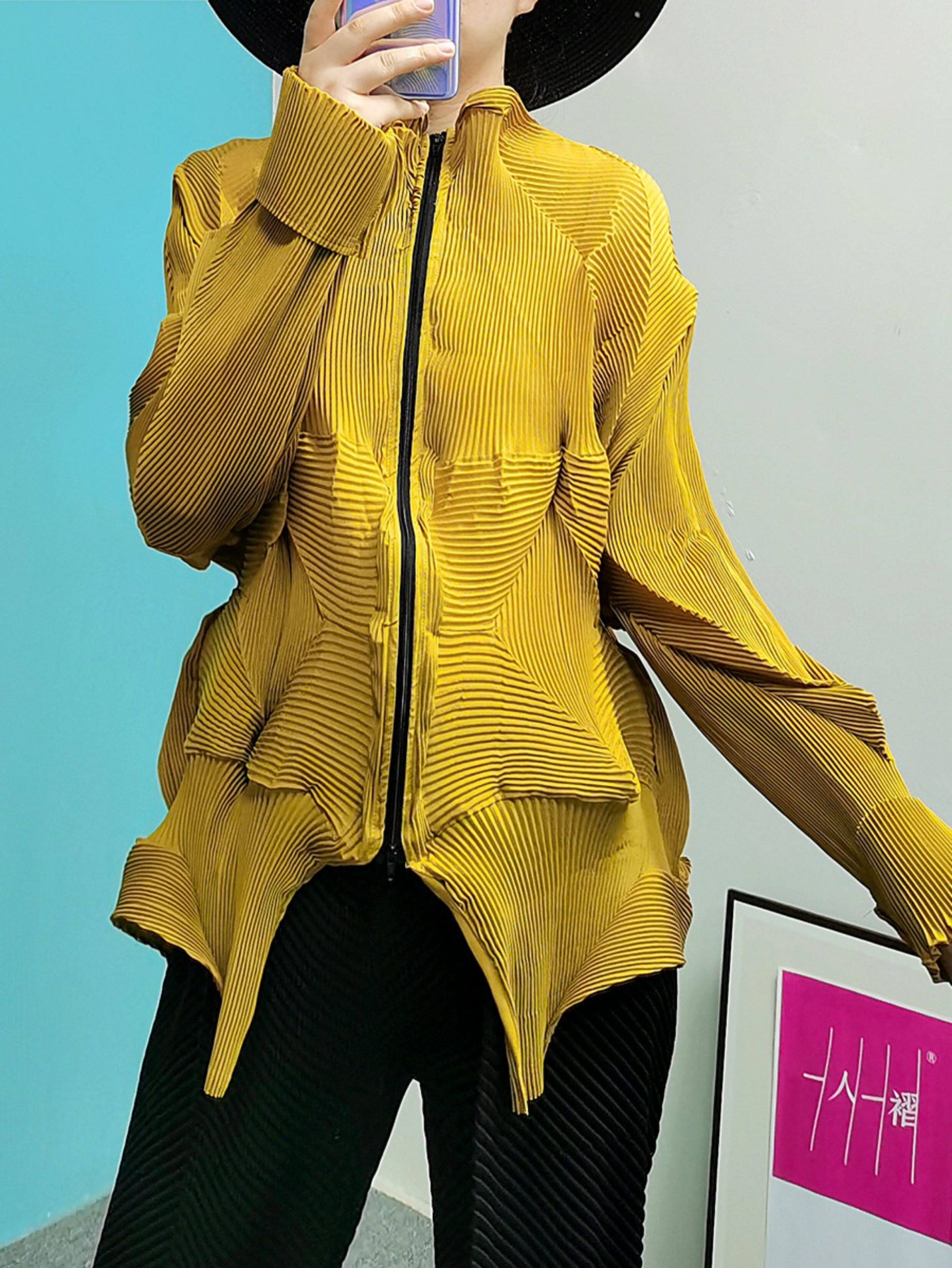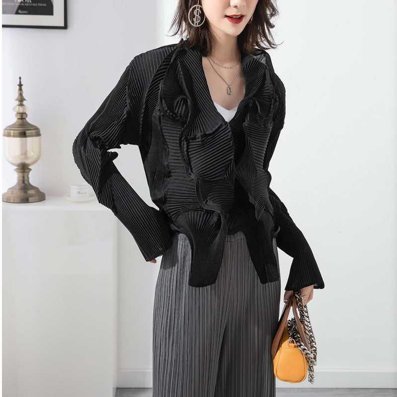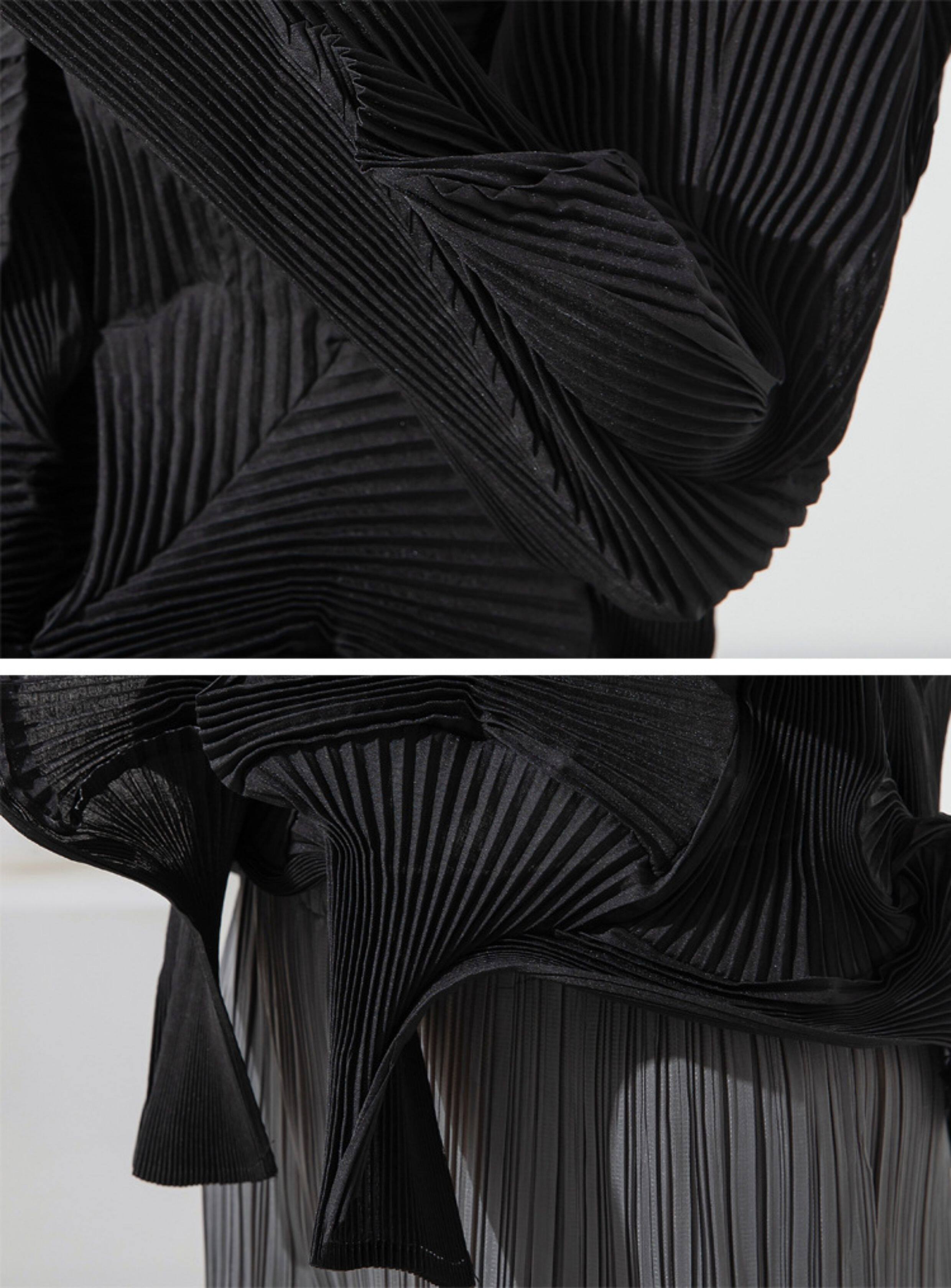 Плиссированный топ на двух пуговицах ручной работы Miyake в западном стиле на шнуровке с неравномерными складками ручной работы и верхней курткой.