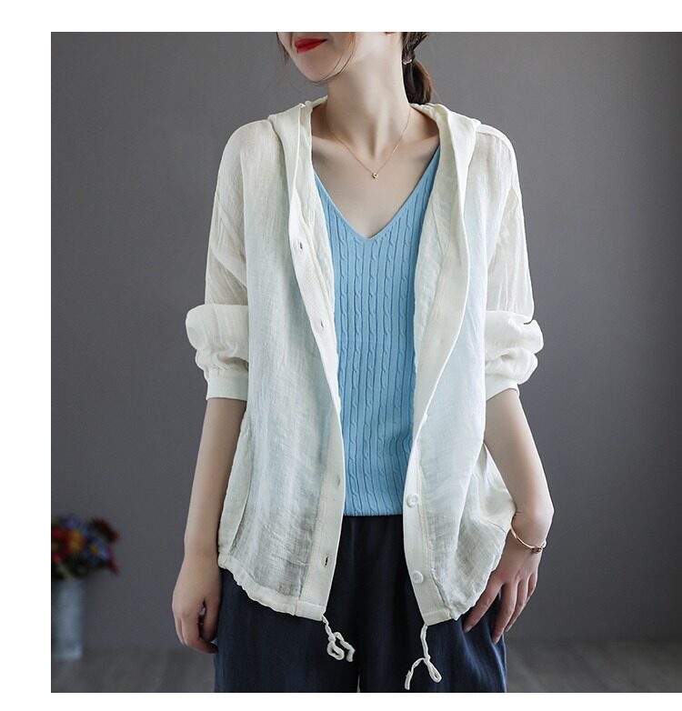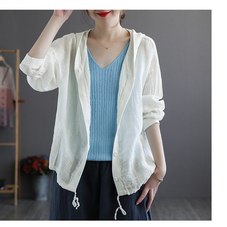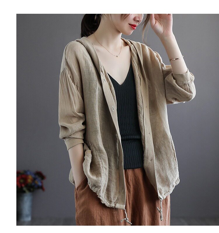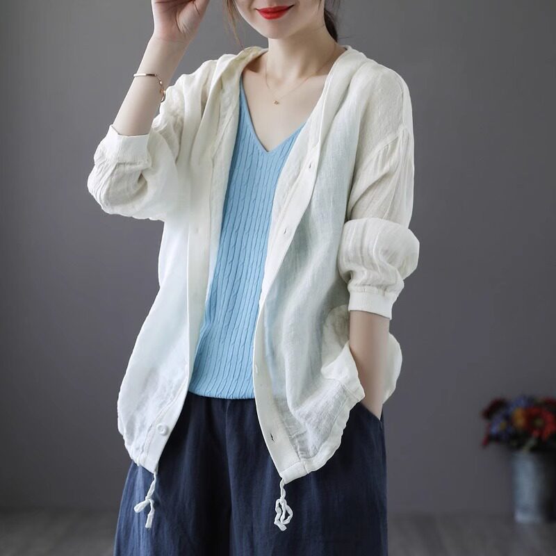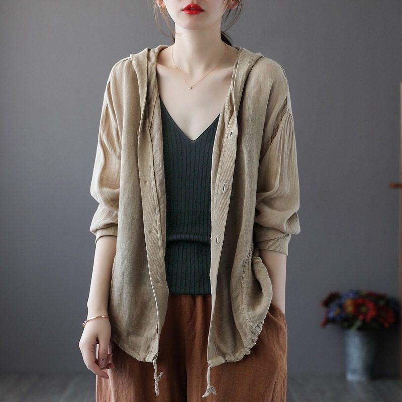 Брендовая толстовка с капюшоном, кардиган, из хлопка и льна, оверсайз, защита от солнца