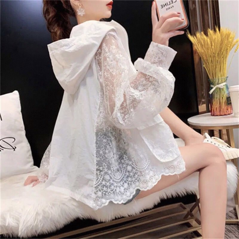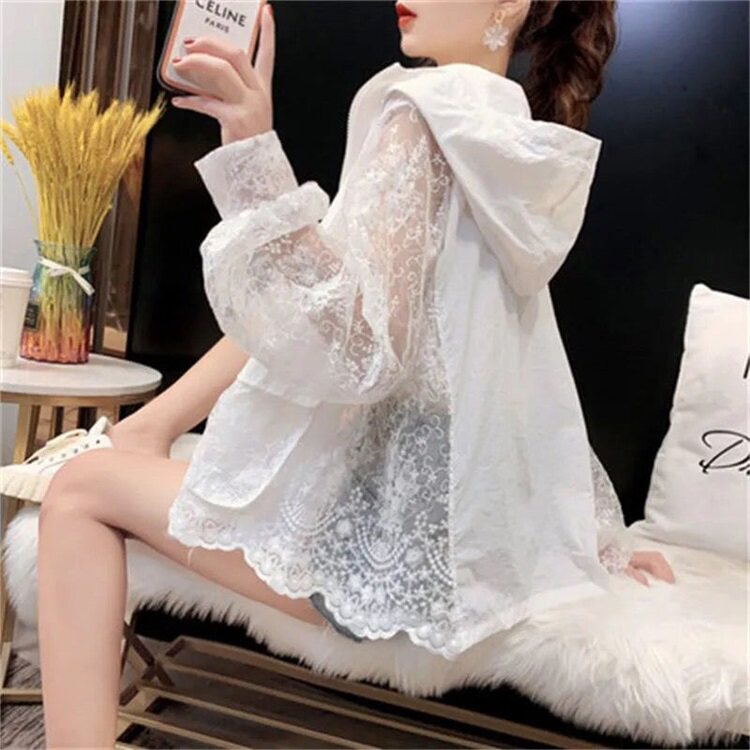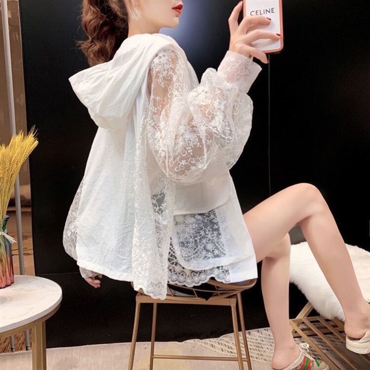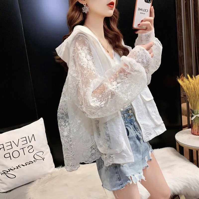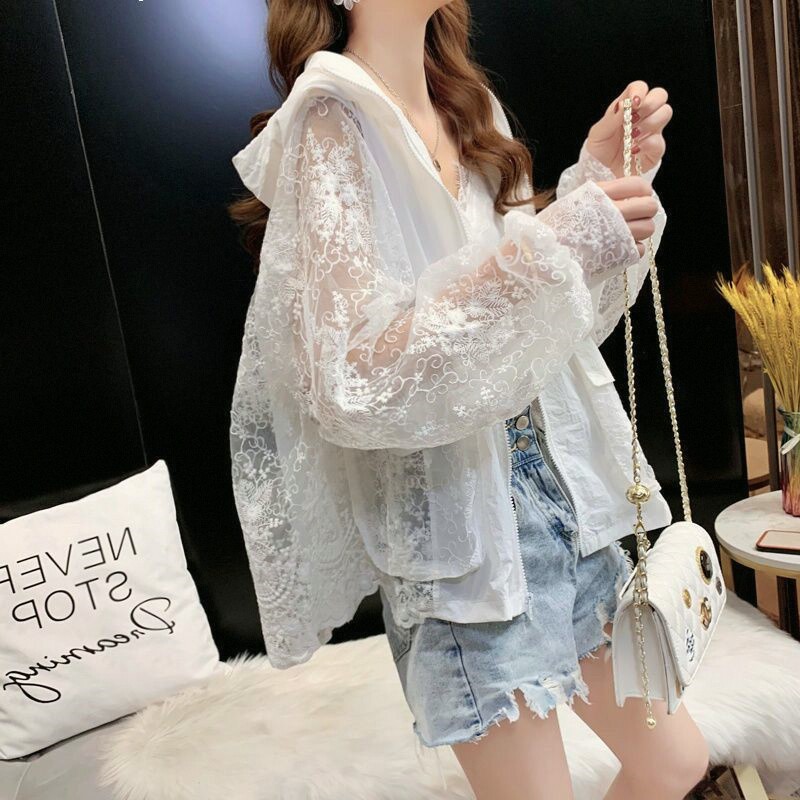 Летняя кружевная одежда для защиты от солнца, тонкая короткая толстовка с капюшоном, кардиган, с вышивкой, популярно в интернете