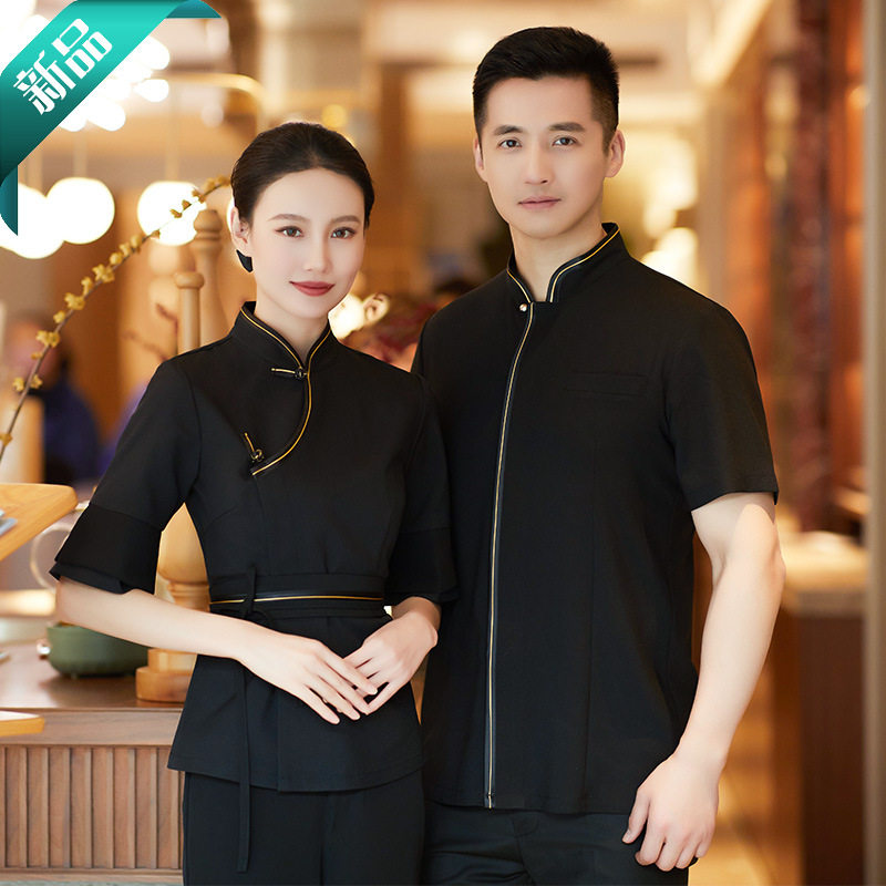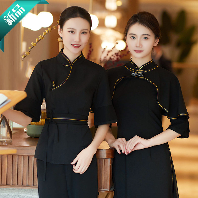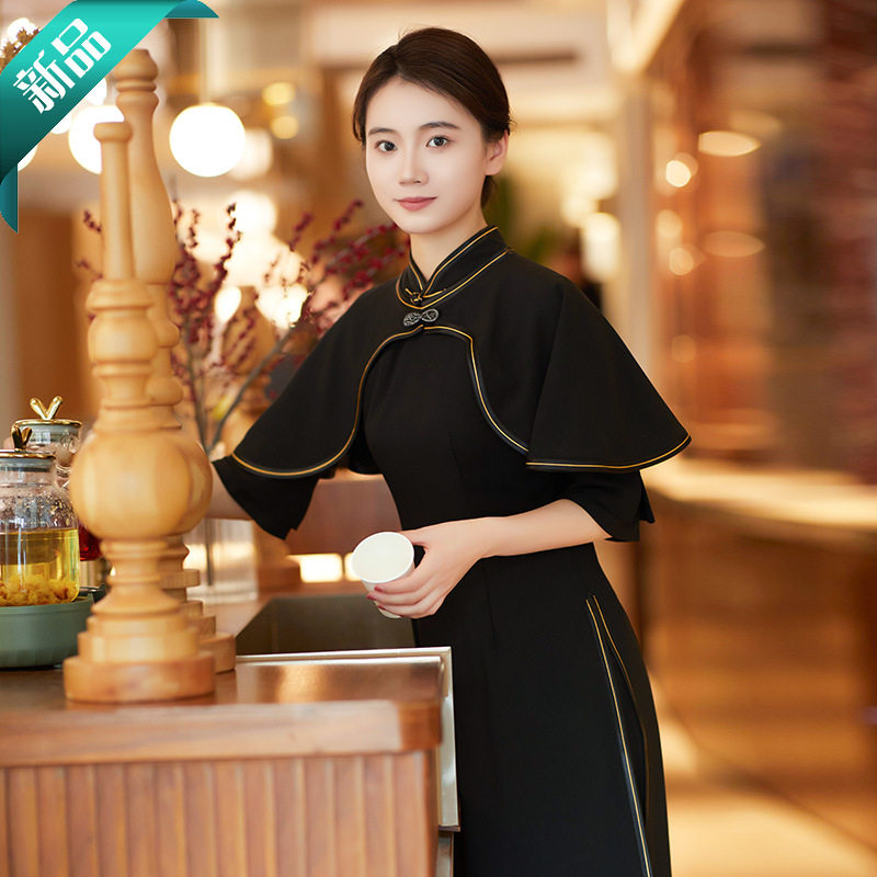 Новый китайский стиль летней двери отеля приветствует женщину-официанта в рабочей одежде элитного банкетного чайного ресторана