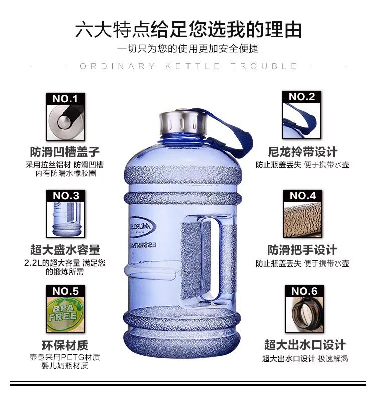Вместительный и большой портативный чайник для спортзала, объем 2, 2200 мл
