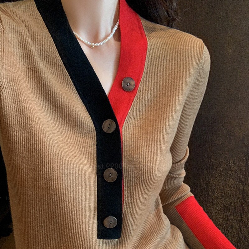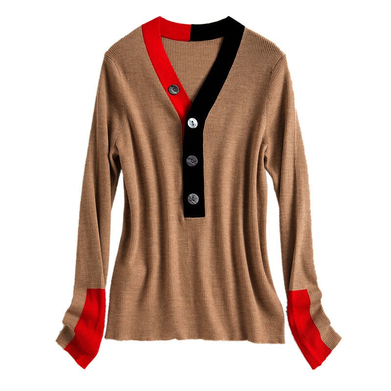 Осенний трикотажный шерстяной свитер, европейский стиль, коллекция 2021, V-образный вырез, облегающий крой