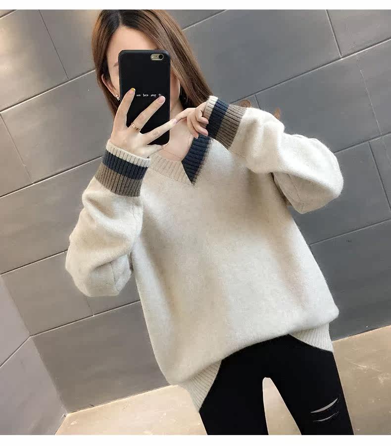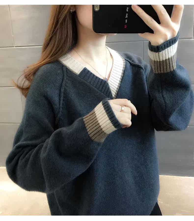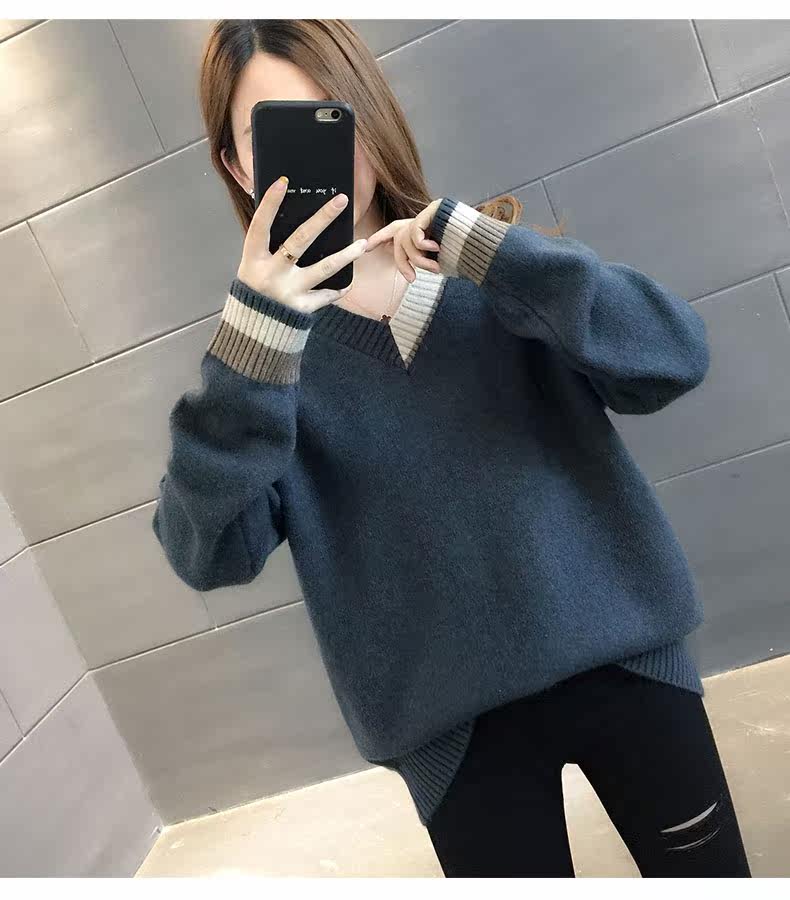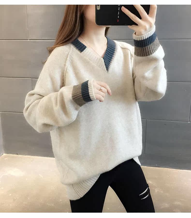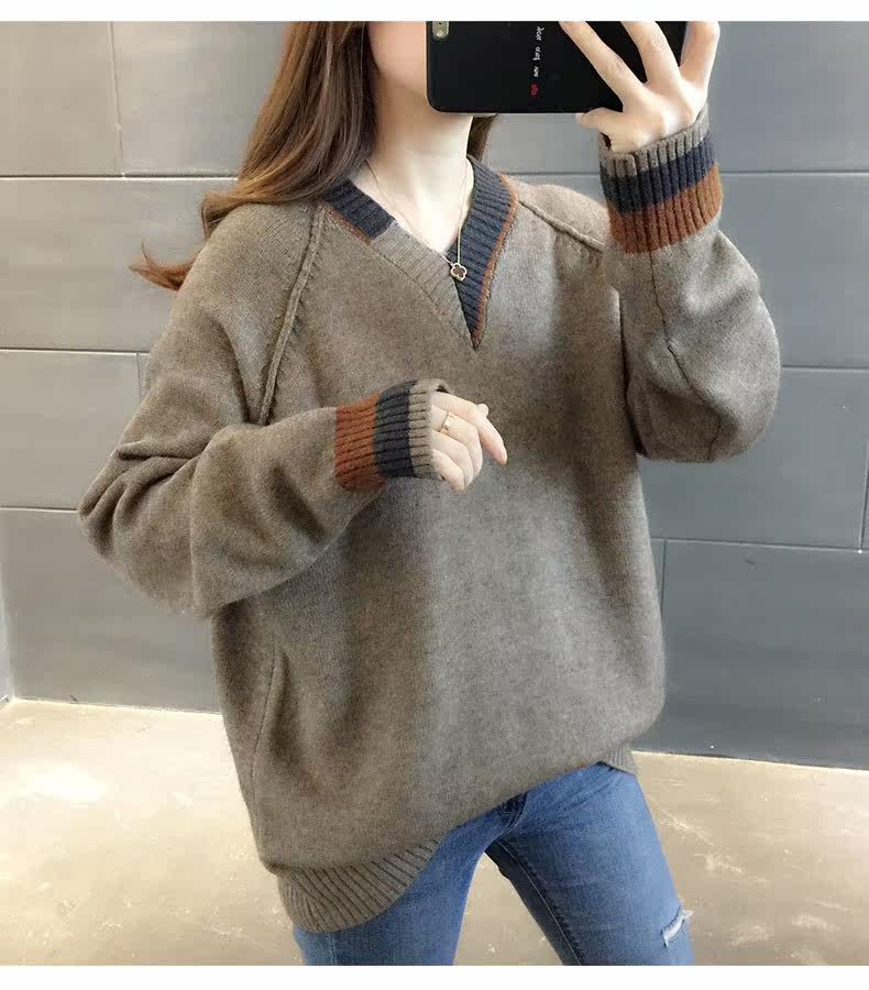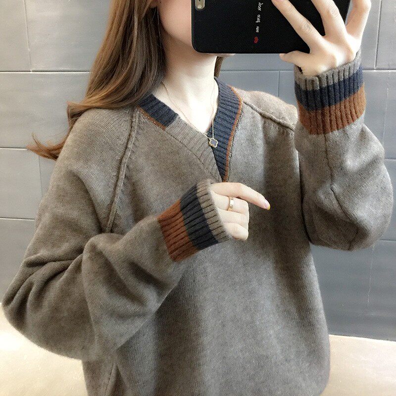 Весенний осенний трикотажный приятный телу свитер, V-образный вырез, оверсайз, в западном стиле