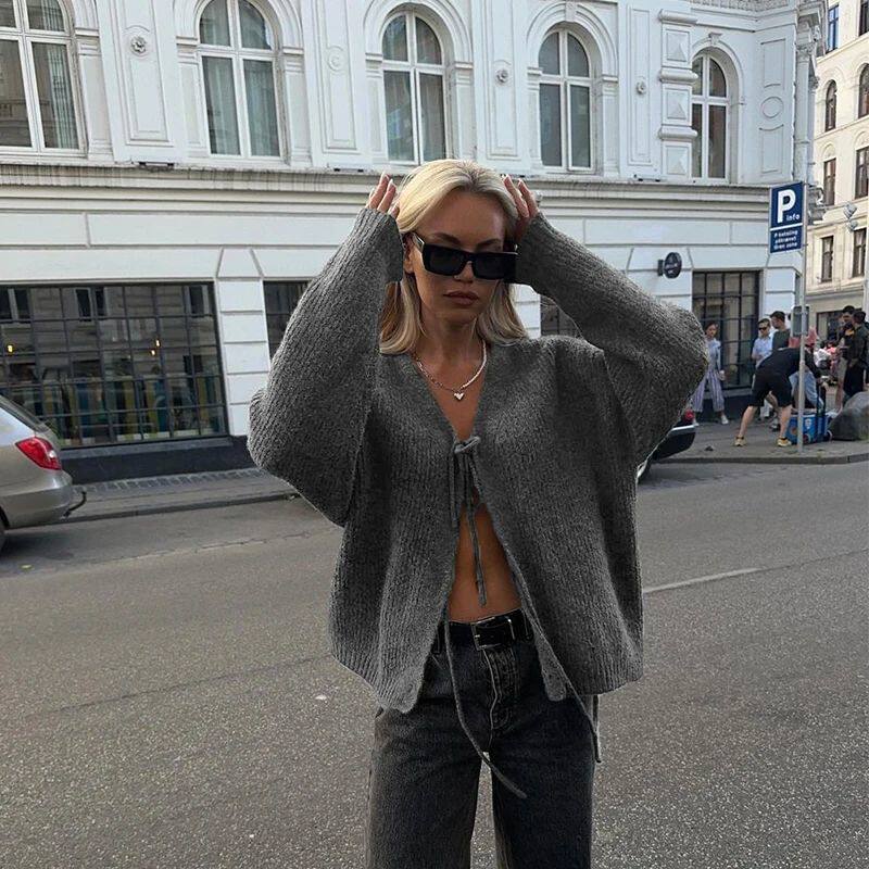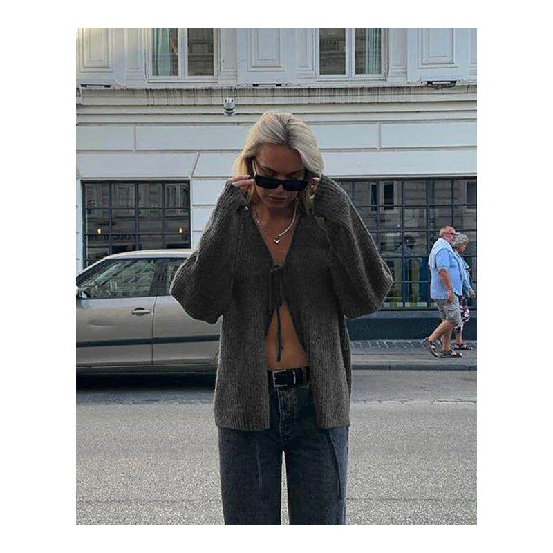 Французский винтажный вязаный кардиган спереди с длинным рукавом серого