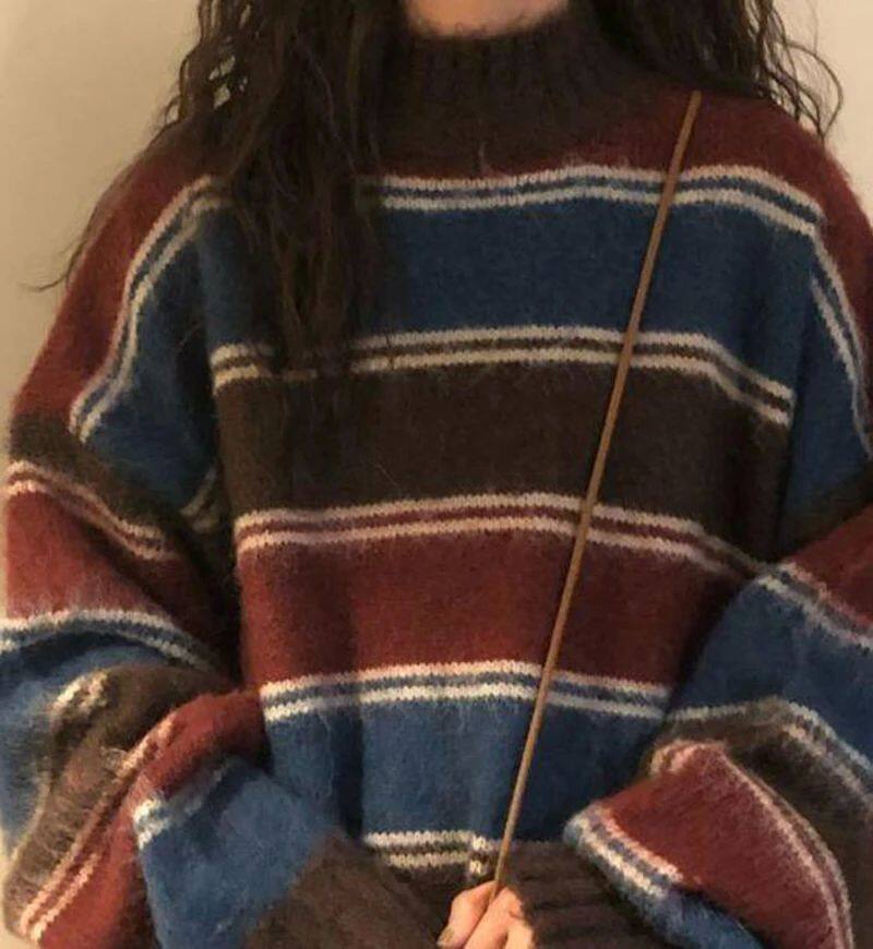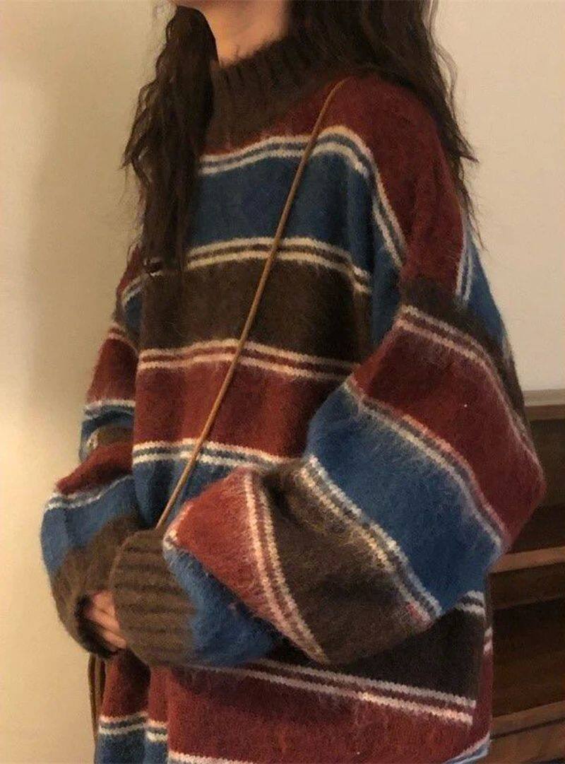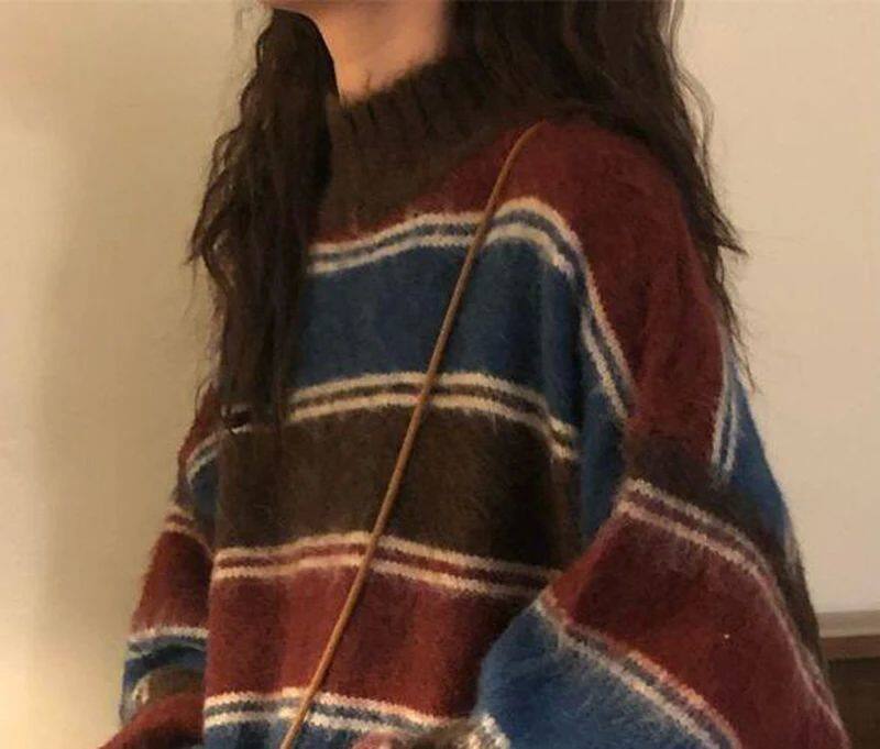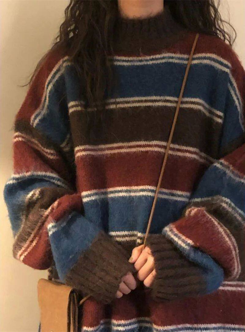 Harajuku вязаные свитера Женщины негабаритные полосатые трикотажные изделия