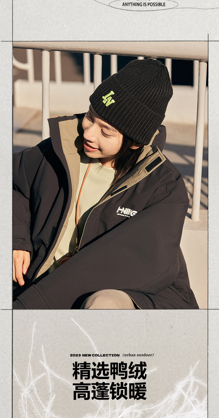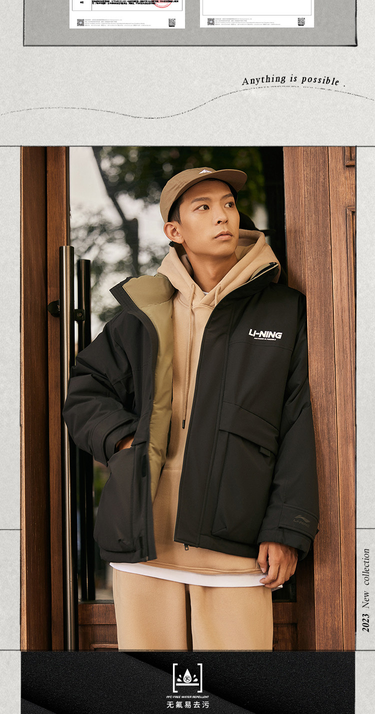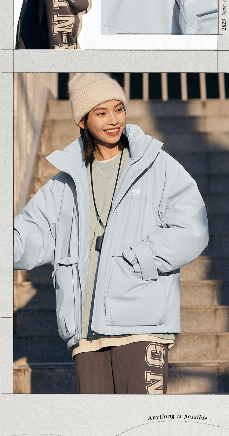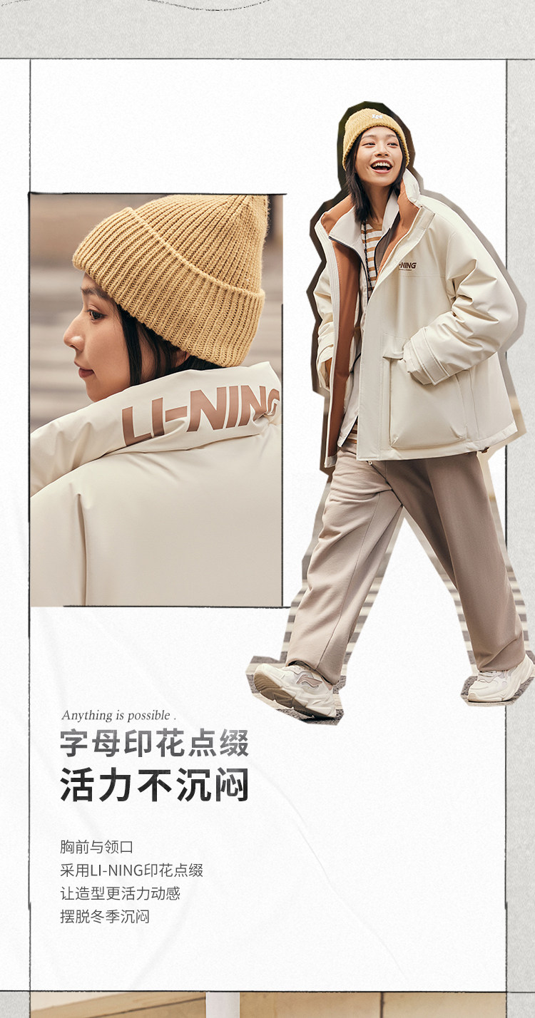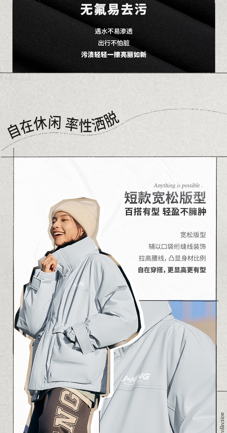 Li Ning, зимний короткий водоотталкивающий бархатный удерживающий тепло спортивный пуховик, утиный пух, оверсайз