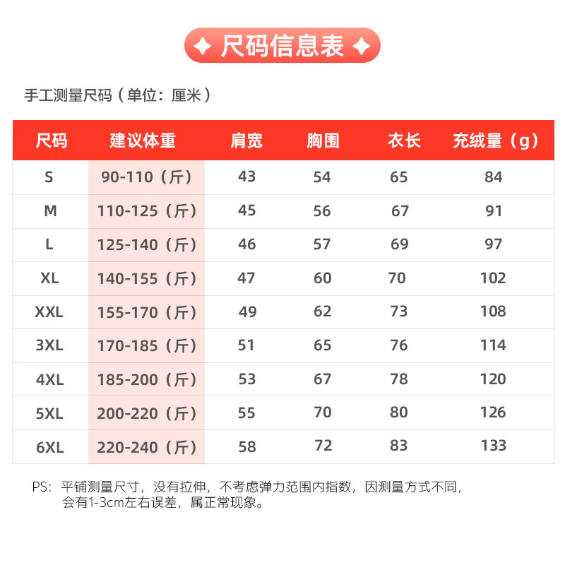 | Размер: | S (предложение 95-110 Catties), М (рекомендуется 110-125 кот), L (предложение 125-140 Catties), Xl (предложение 140-155 кот), 2xl (рекомендуется 155-170 Catties), 3xl (рекомендуется 170-185 котли, 4xl (рекомендуется 185-200 кот) |