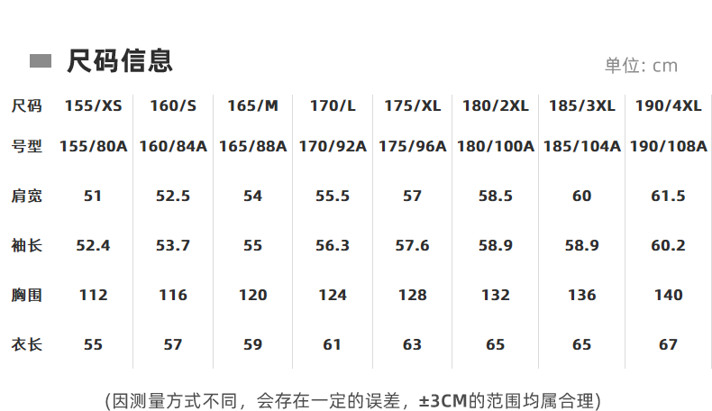| Размер: | 155/XS, 160/S, 165/M, 170/L, 175/XL, 180/2XL, 185/3XL, 190/4XL |
