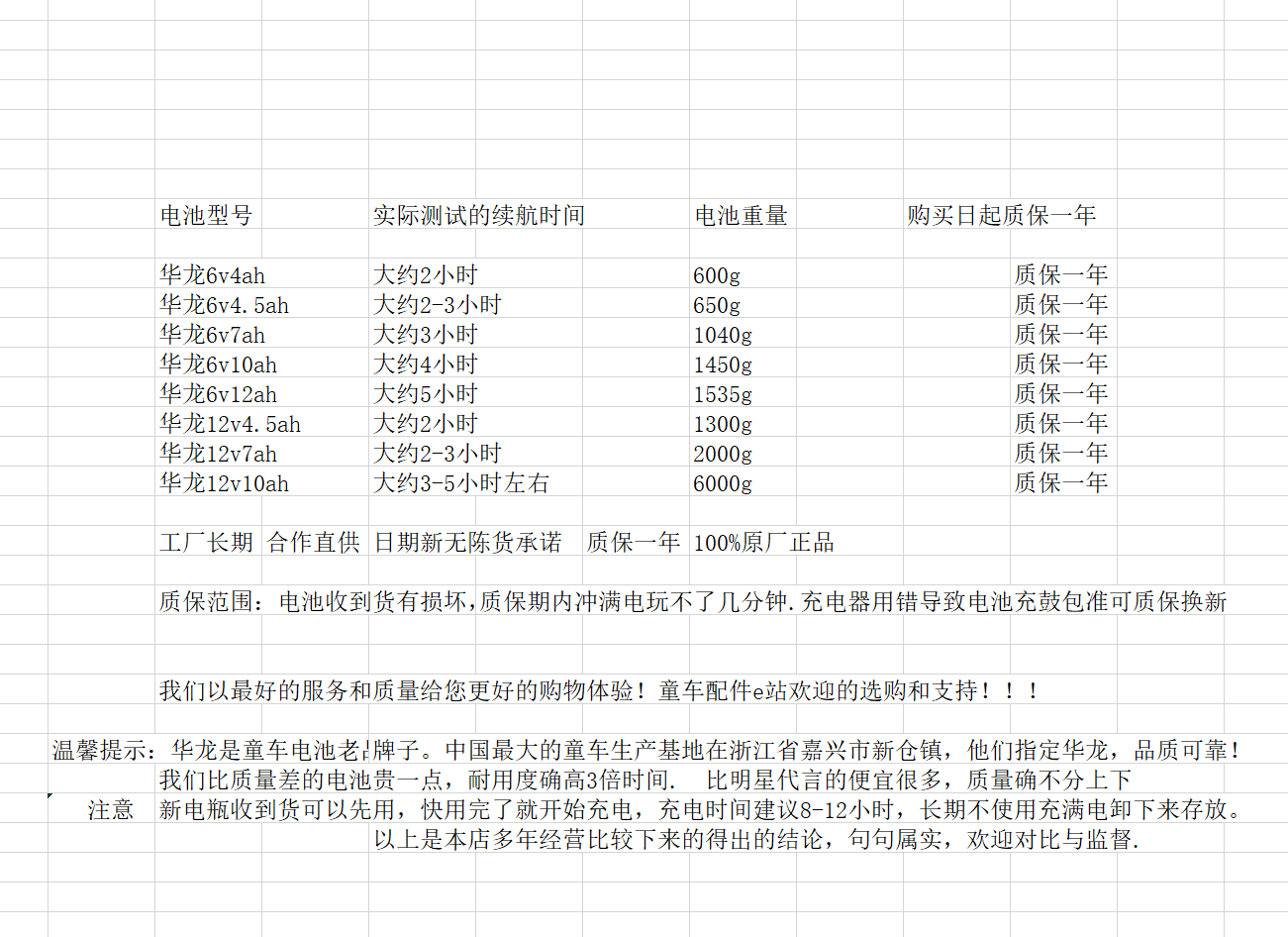 :Торжественное обещание: на аккумулятор, приобретенный у элитного бренда Hualong, предоставляется годовая гарантия, и если он сломается в течение гарантийного срока, его заменят бесплатно.Только при хорошем качестве мы можем быть уверены, что заменим его на новый бесплатно. Например, дешевые батареи обычно теряют свою мощность менее чем через год., Срок службы высококачественных батарей Hualong составляет 4-5 лет, одна может быть такой же хорошей, как три обычных, цена всего на несколько долларов больше, чем у обычных, а время использования в 2 раза дольше, чем у более дешевых батарей, поэтому выбор Hualong не является ошибкой, он более экономичен и беззаботен.Hualong Aohuang — проверенный временем бренд, экспортирующий свою продукцию в Европу и США. На протяжении многих лет этот бренд является обозначенным брендом аккумуляторов для экспорта детских автомобилей и зарекомендовал себя на рынке благодаря надежному качеству.Наш магазин еще раз обещает, что на продаваемые аккумуляторы бренда Hualong будет действовать гарантия один год (с момента заказа) и 15 дней возврата без причины.Бесплатная страховка обратной доставки, добро пожаловать на покупку!