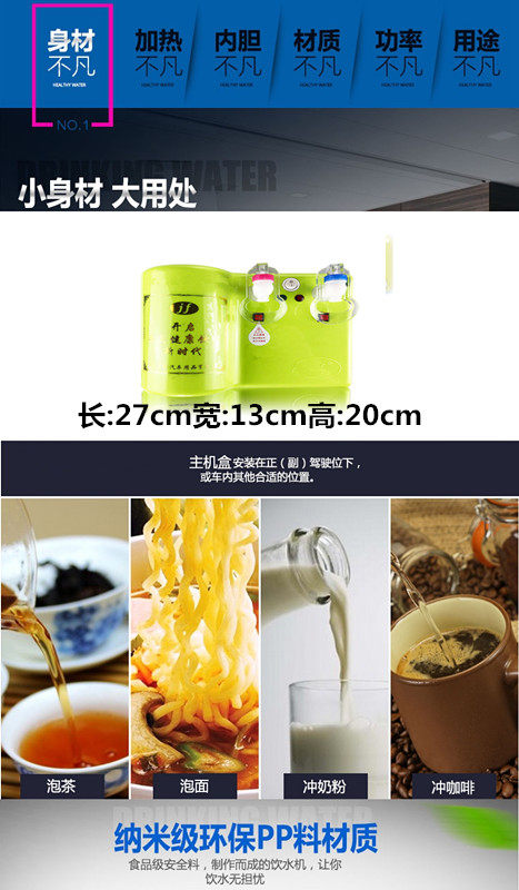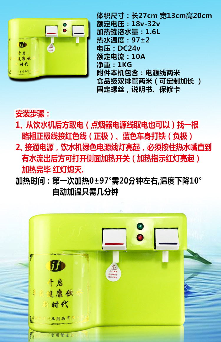 Этот продукт является небольшим, легким весом, высокой температурой нагрева и разумно использует источник питания транспортных средств.Низкое напряжение, безопасная, интуитивная работа, простая и удобная, используйте двойную конструкцию управления температурой, 12 часов без выключения интеллектуального дозатора воды без какого -либо влияния на аккумулятор!Чтобы решить путаницу воды и наблюдать за водой для большинства водителей, проблема недостаточных тепловых бутылок!