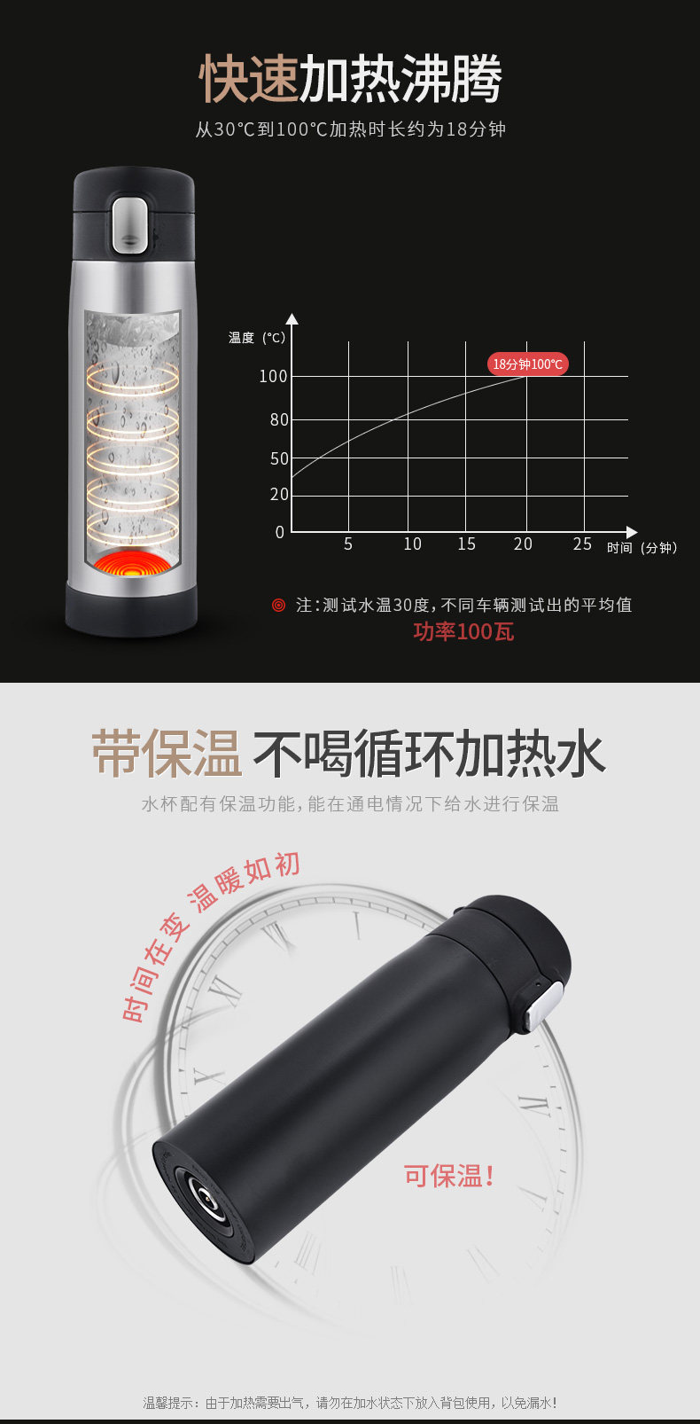 Теплое напоминание: нагревательная чашка отличается от обычной чашки термос. Поскольку пара постоянно генерируется и разряжается при кипящей воде, крышка чашки предназначена с дышащими отверстиями. Когда чашка сложена или наклона, вода протекает. Это нормальная ситуация и не является проблемой качества.