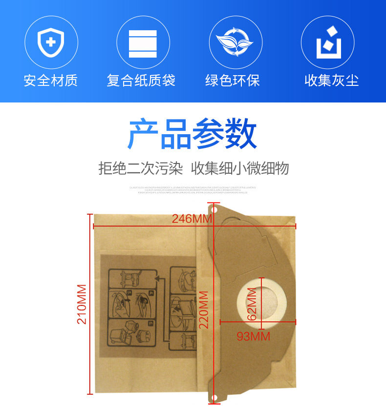 【Особенности продукта】Композиционные бумажные пакеты пыли, двойная фильтрационная пыль, высокая эффективность фильтрации, эффективно ингибируя бактериальную выживаемость, одно время использования, защита окружающей среды и гигиена.