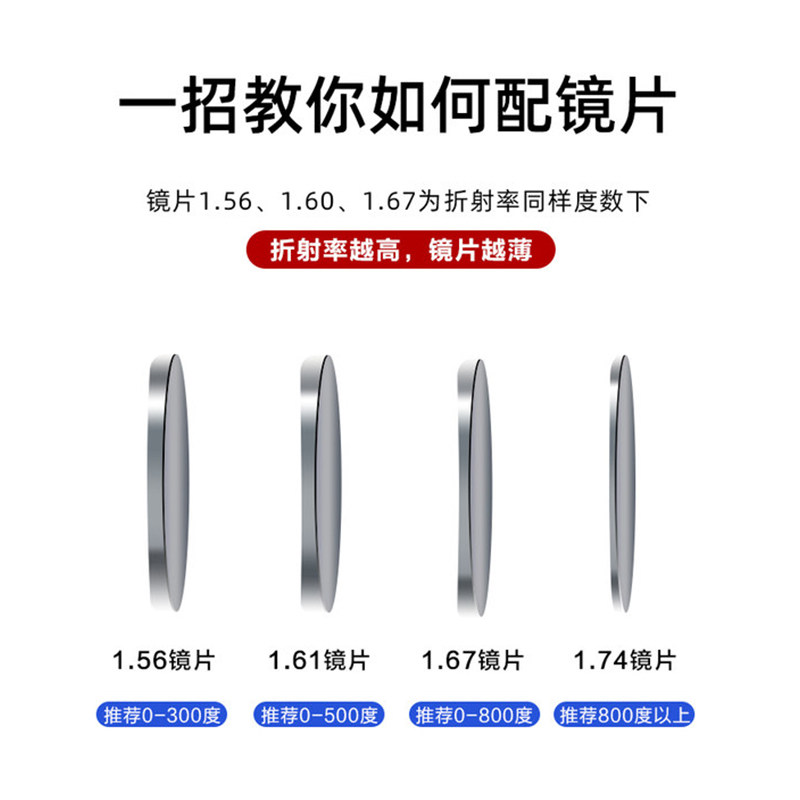 | Показатель преломления линзы: | 1,56 (тонкий), 1,61 (тонкий), 1,67 (ультра -тщательный), 1,74 (ультра -тщательный) |