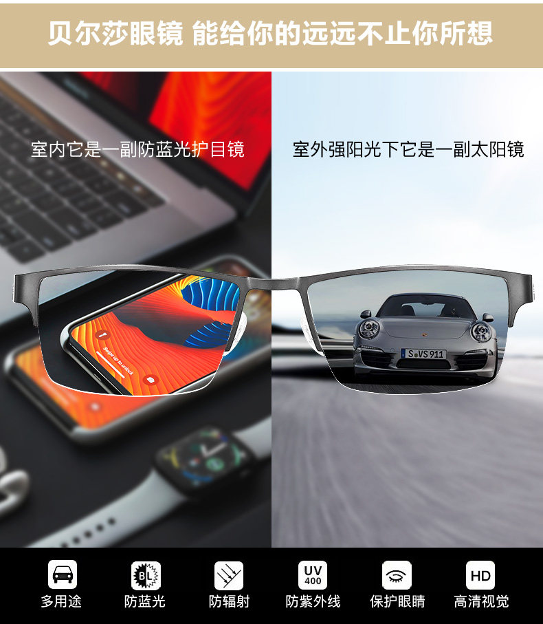 Belsa Pure Titanium Myopia Glasses Мужские половины плоского света. Компьютерный светлый свет, недобросовестный, защита глаз, бизнес, смена цвета, бокалы