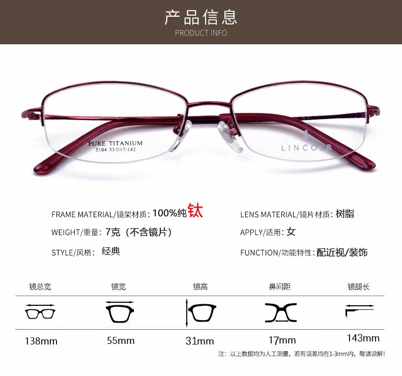 晓晓光学 Высококачественная рама чистого титанового линза со 100% титановым полумротом классическая радиационная и аллергическая ультра-освещенная линза миопий