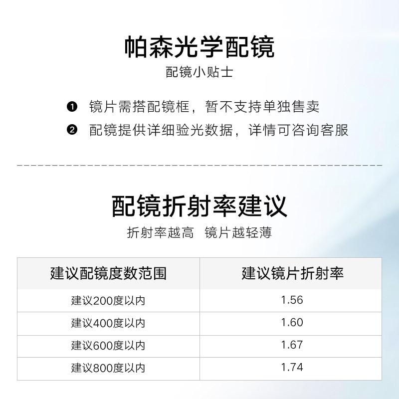 | Показатель преломления линзы: | 1,60 (тонкий), 1,67 (ультра -тщательный), 1,74 (ультра -тщательный) |