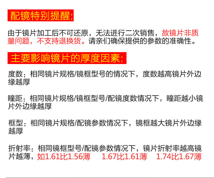 | Показатель преломления линзы: | 1,56 (тонкий), 1,61 (тонкий), 1,67 (ультра -тщательный), 1,73 (ультра -тщательный) |