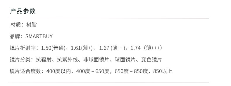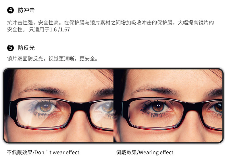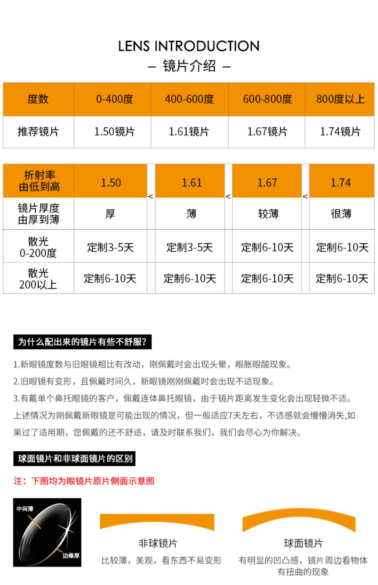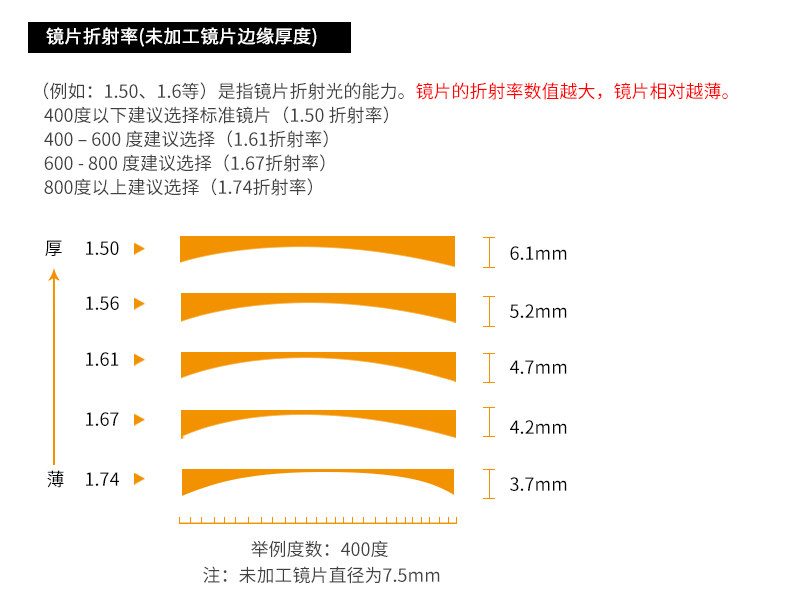 | Показатель преломления линзы: | 1.50 (обычный), 1,61 (тонкий), 1,67 (ультра -тщательный), 1,74 (ультра -тщательный) |