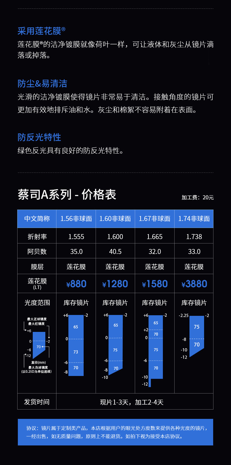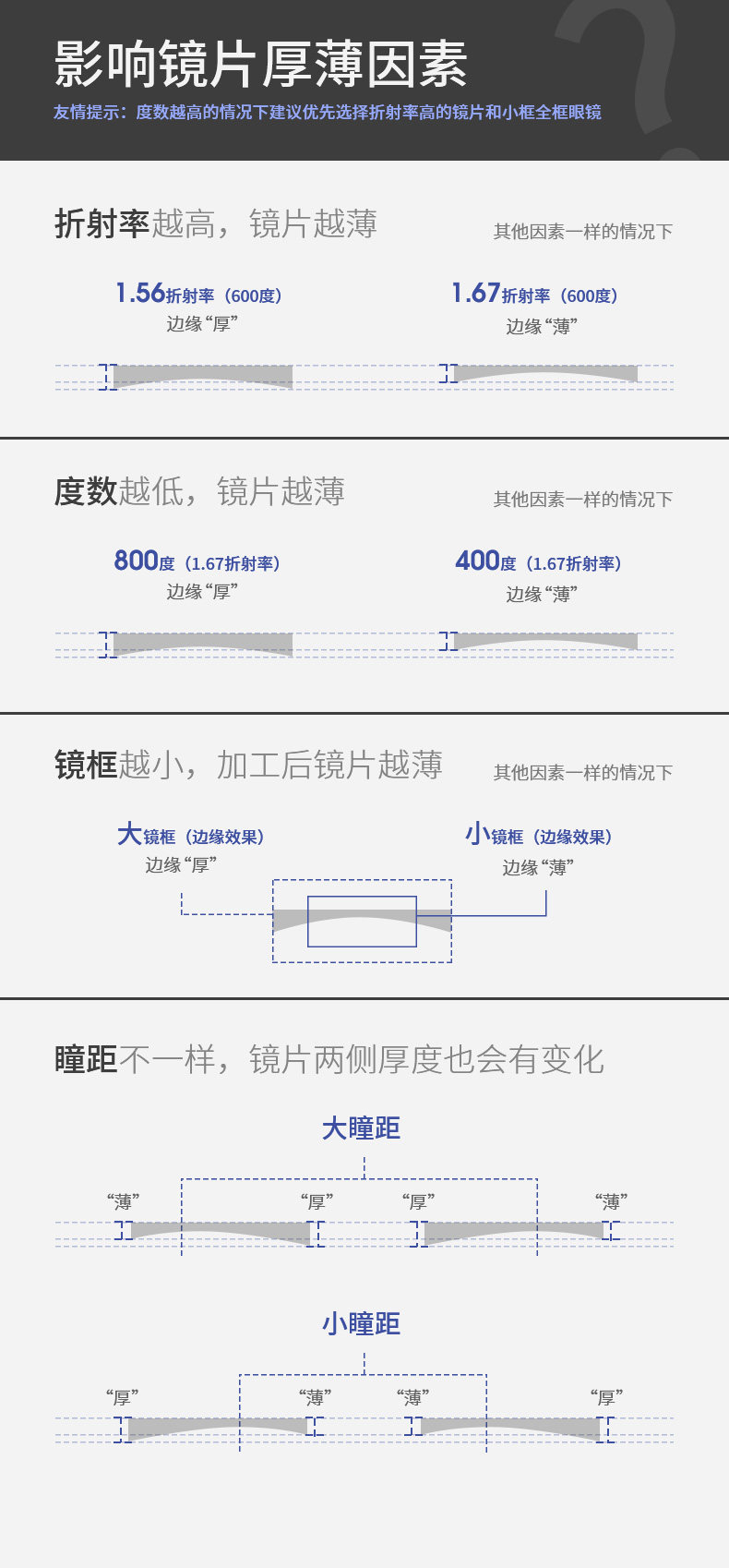 | Показатель преломления линзы: | 1.49 (обычный), 1,56 (тонкий), 1,61 (тонкий), 1,67 (ультра -тщательный), 1,73 (ультра -тщательный) |